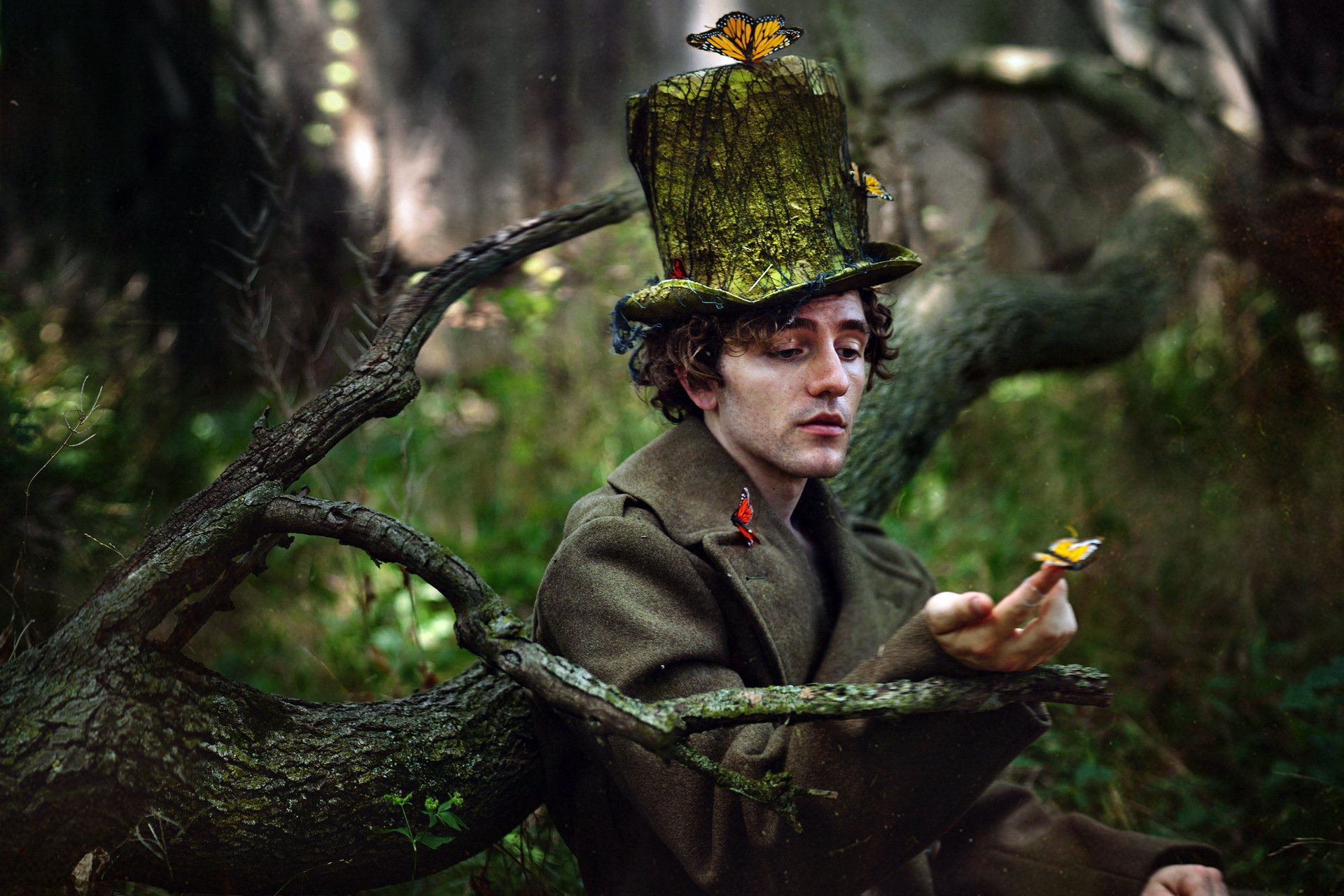 Ein Mann geht mit einer Vogelscheuche durch ein schreckliches Feld