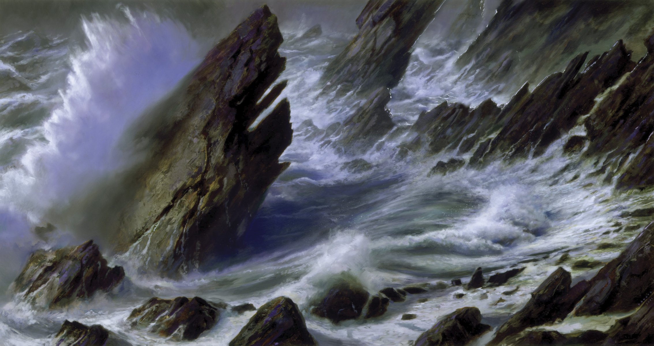 Unter den tosenden Meereswellen ist ein Mann auf einem Floß, viele Haie sind unter Wasser