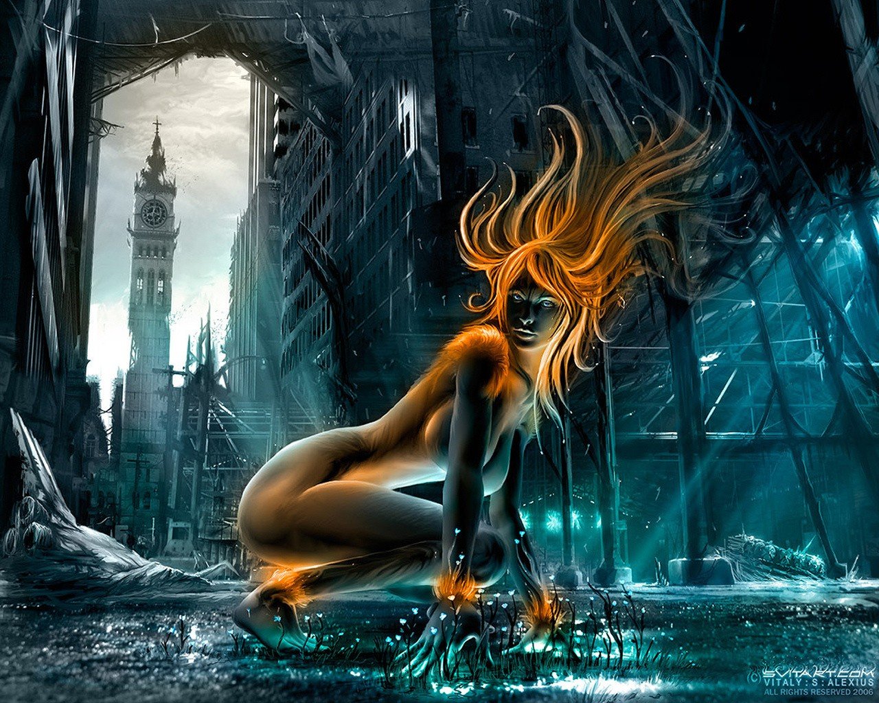 Nacktes Mädchmit feurigen Haaren, Armbändern an Armen und Beinen auf einem düsteren Hintergrund der Stadt