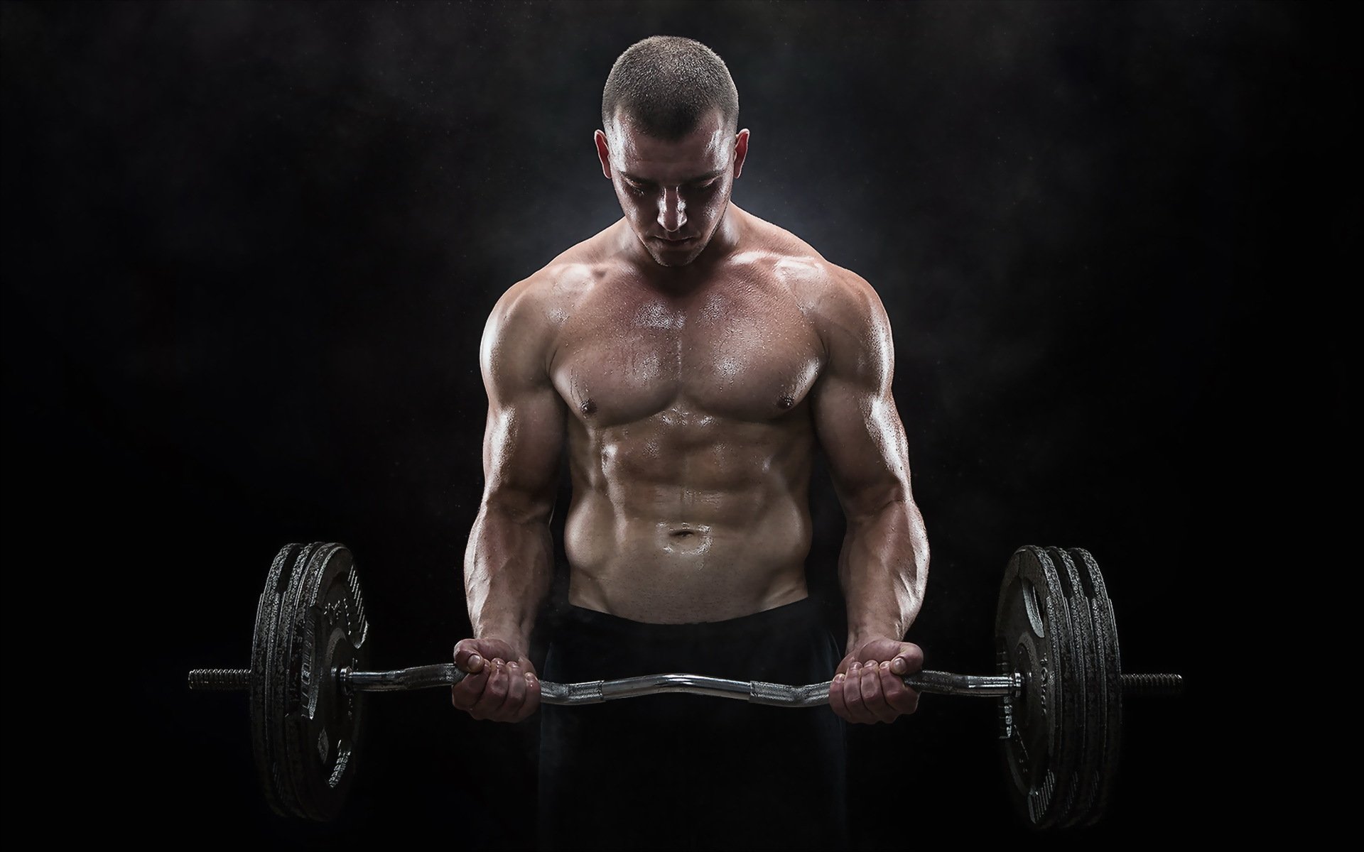 Der Typ führt eine körperliche Übung mit einer Langhantel durch
