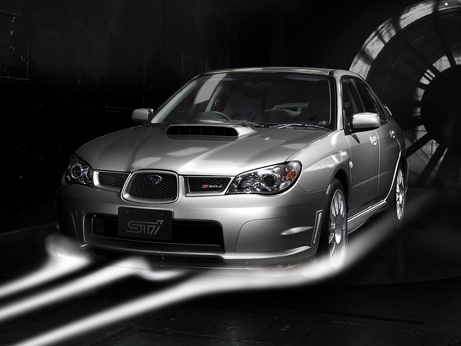 Silbriger Subaru in einem Rohr auf schwarzem Hintergrund