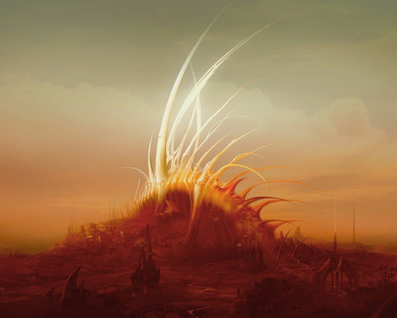 Ein Turm, der von Schiffen im Fantasy-Stil umgeben ist