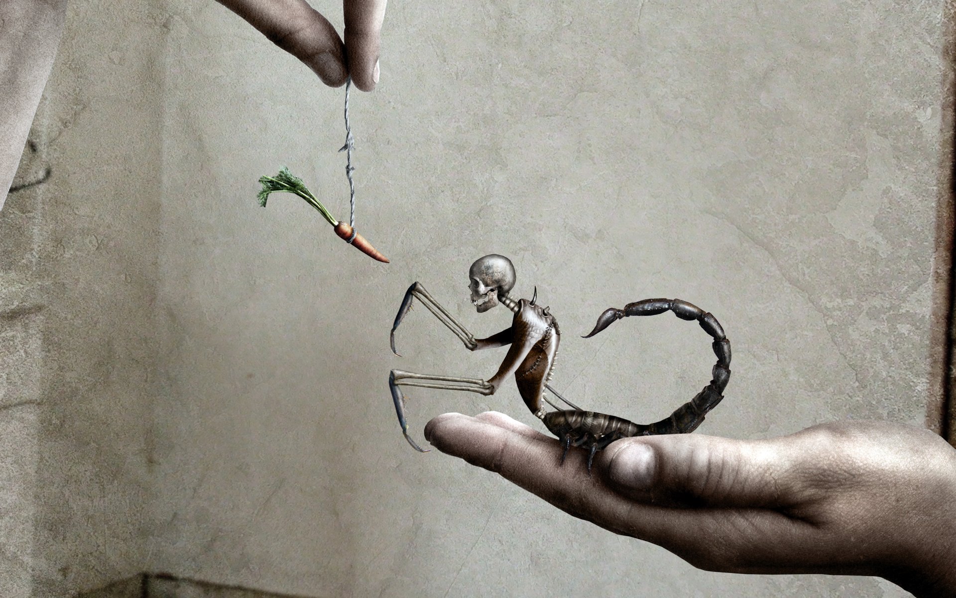 Ein seltsames Wesen auf der Hand, das Karotten liebt
