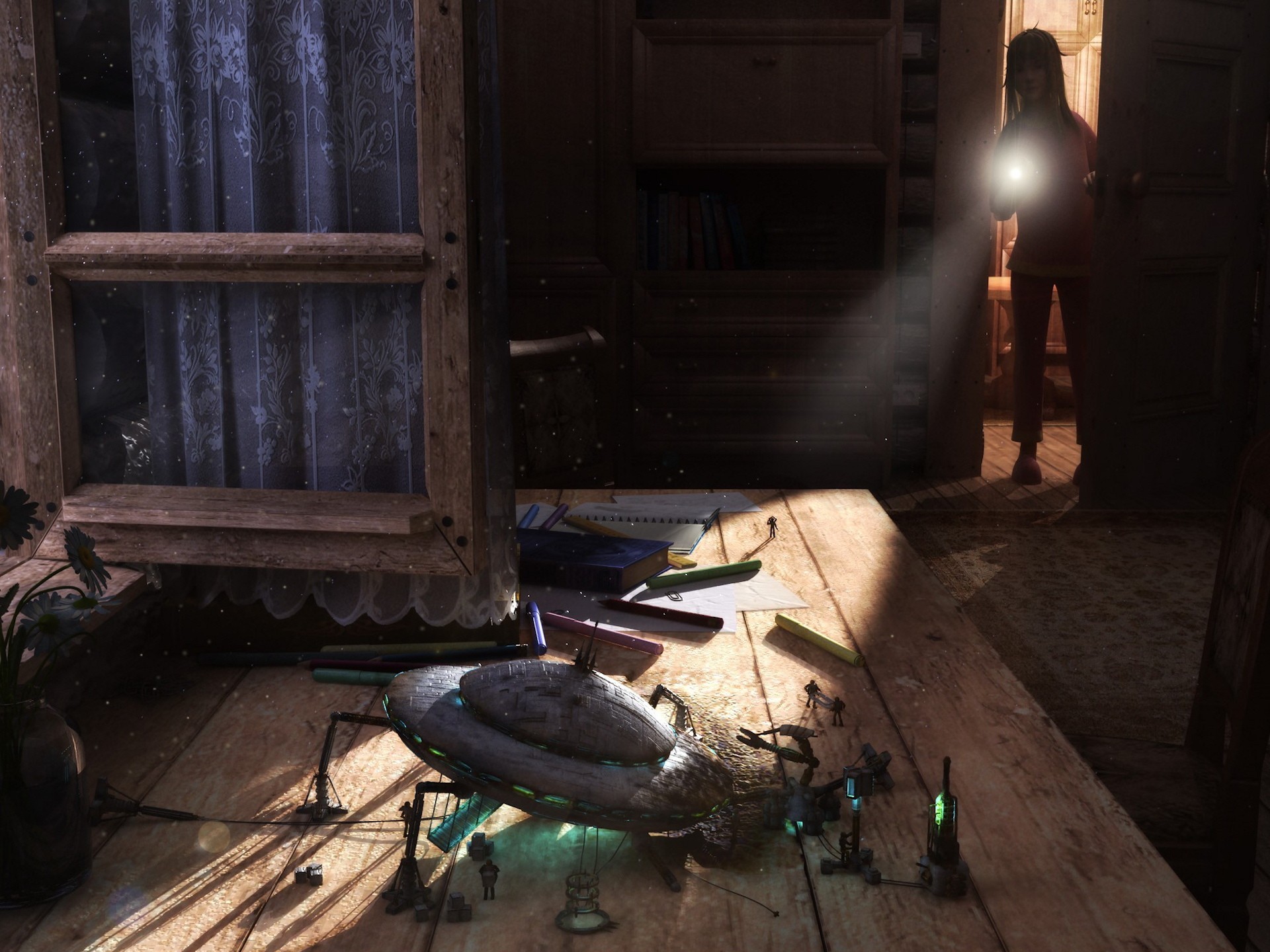 Ein Kind mit Fonsrick beobachtet ein UFO