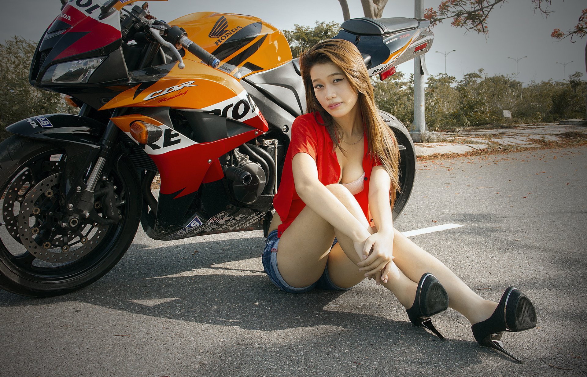 Asiatische Frau posiert vor dem Hintergrund eines Motorradfahrers