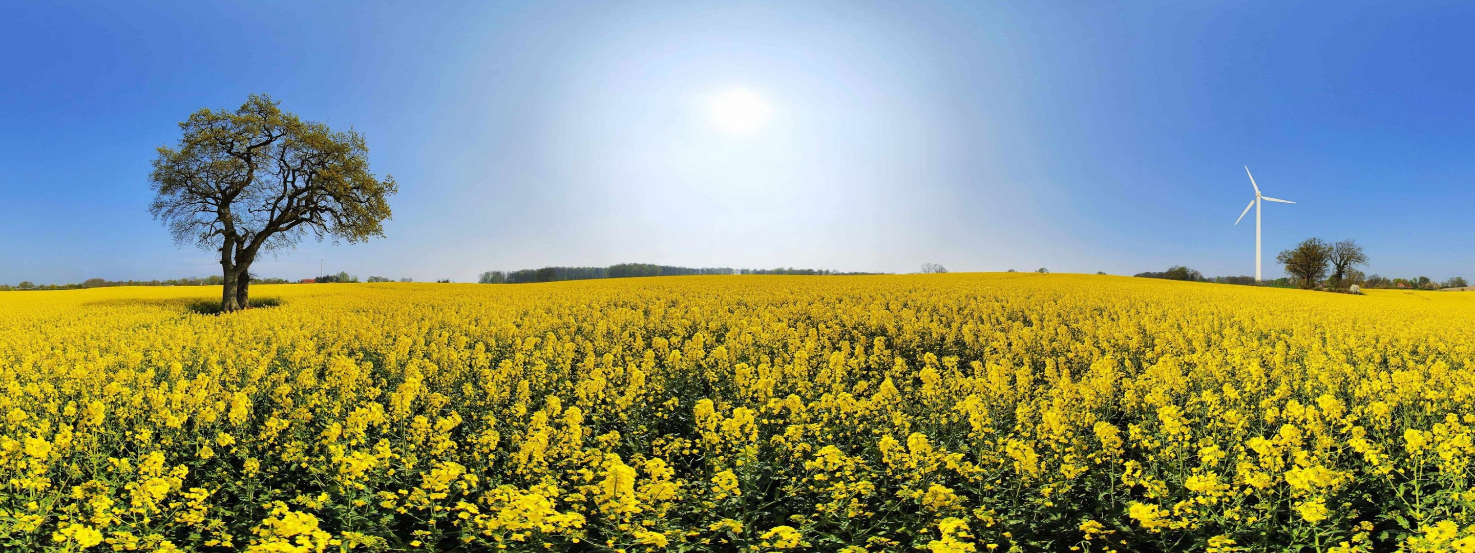 Ein von der Sonne beleuchtetes Feld unter den Wolken
