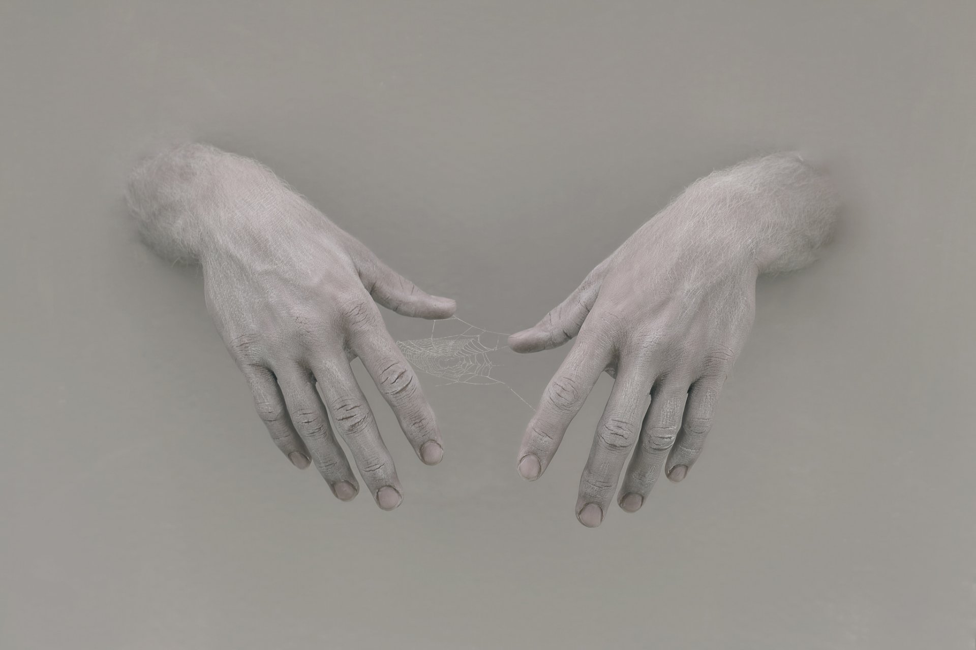 Spinnennetz zwischen den Händen auf grauem Hintergrund