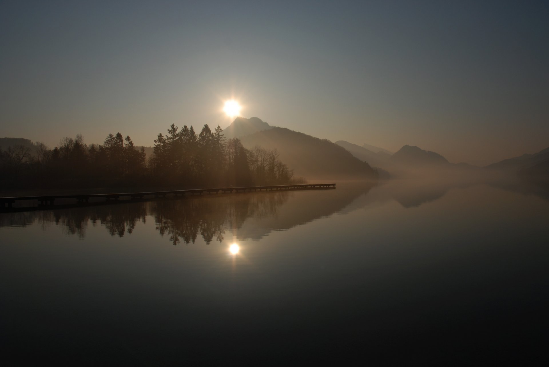 Der Sonnenaufgang kam wegen der Morgennebel-Berge heraus