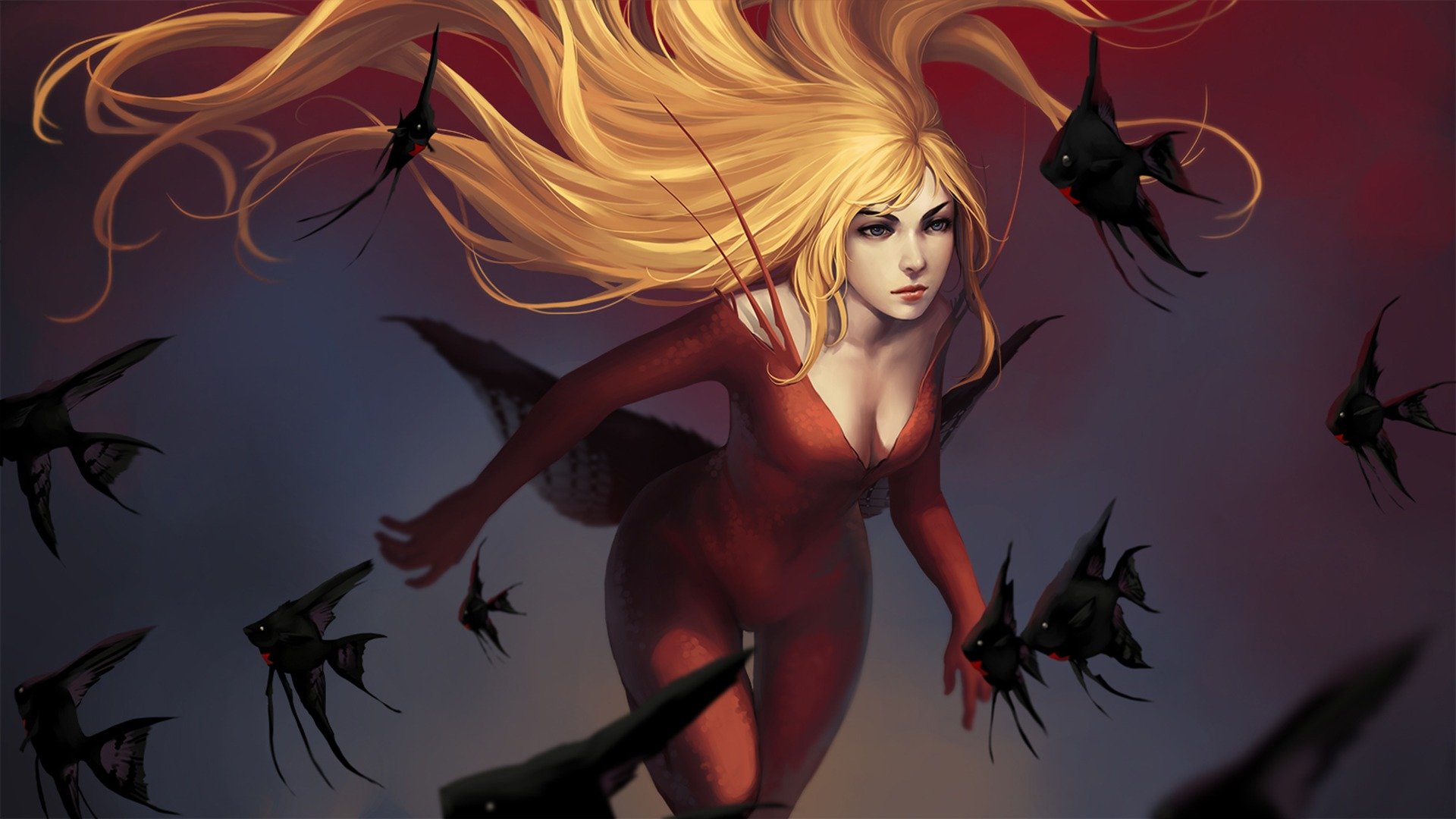 Eine in die Ferne schauende rothaarige Dame mit einer grauen Katze, die sich in ihr Haar eingeklemmt hat