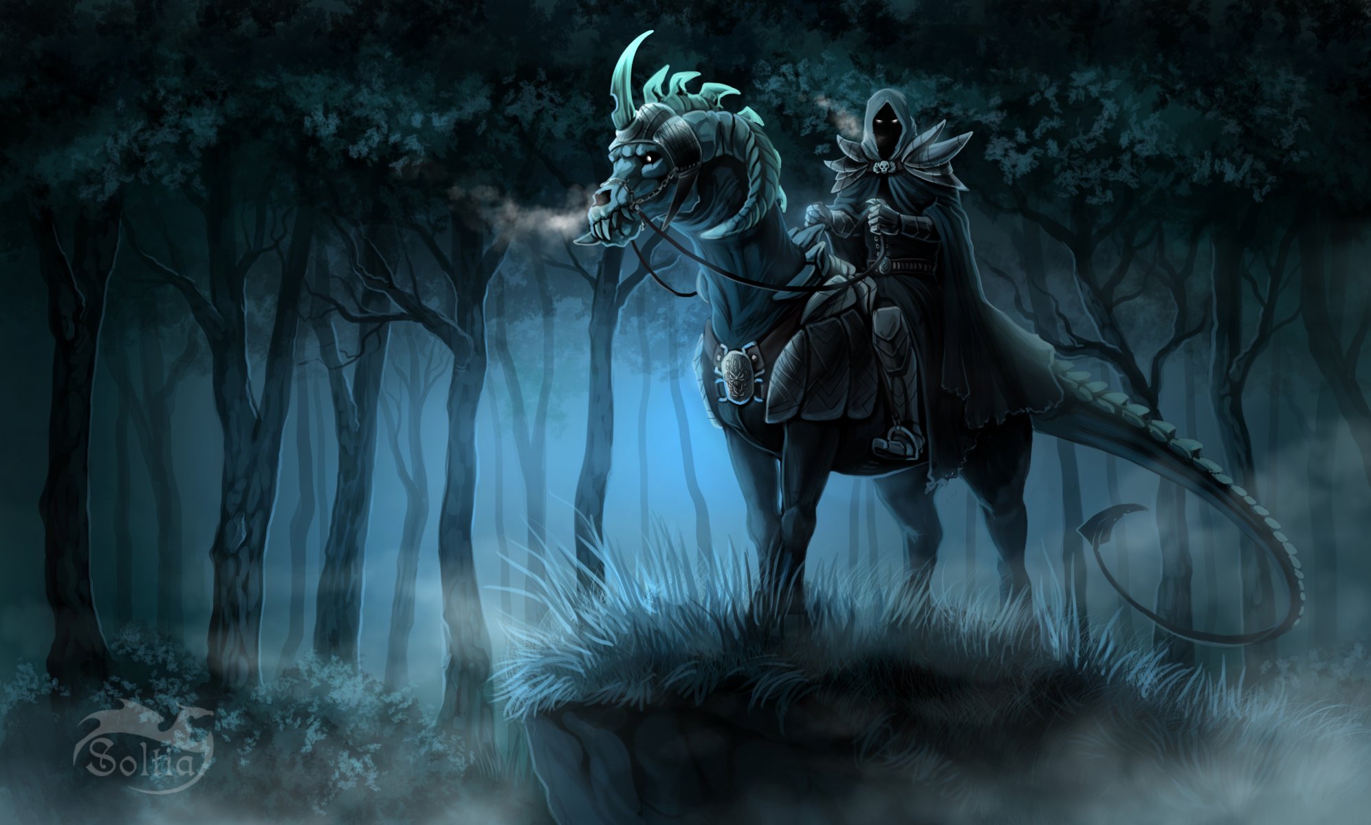 Dunkler Reiter auf einem Geisterpferd im nebligen Wald