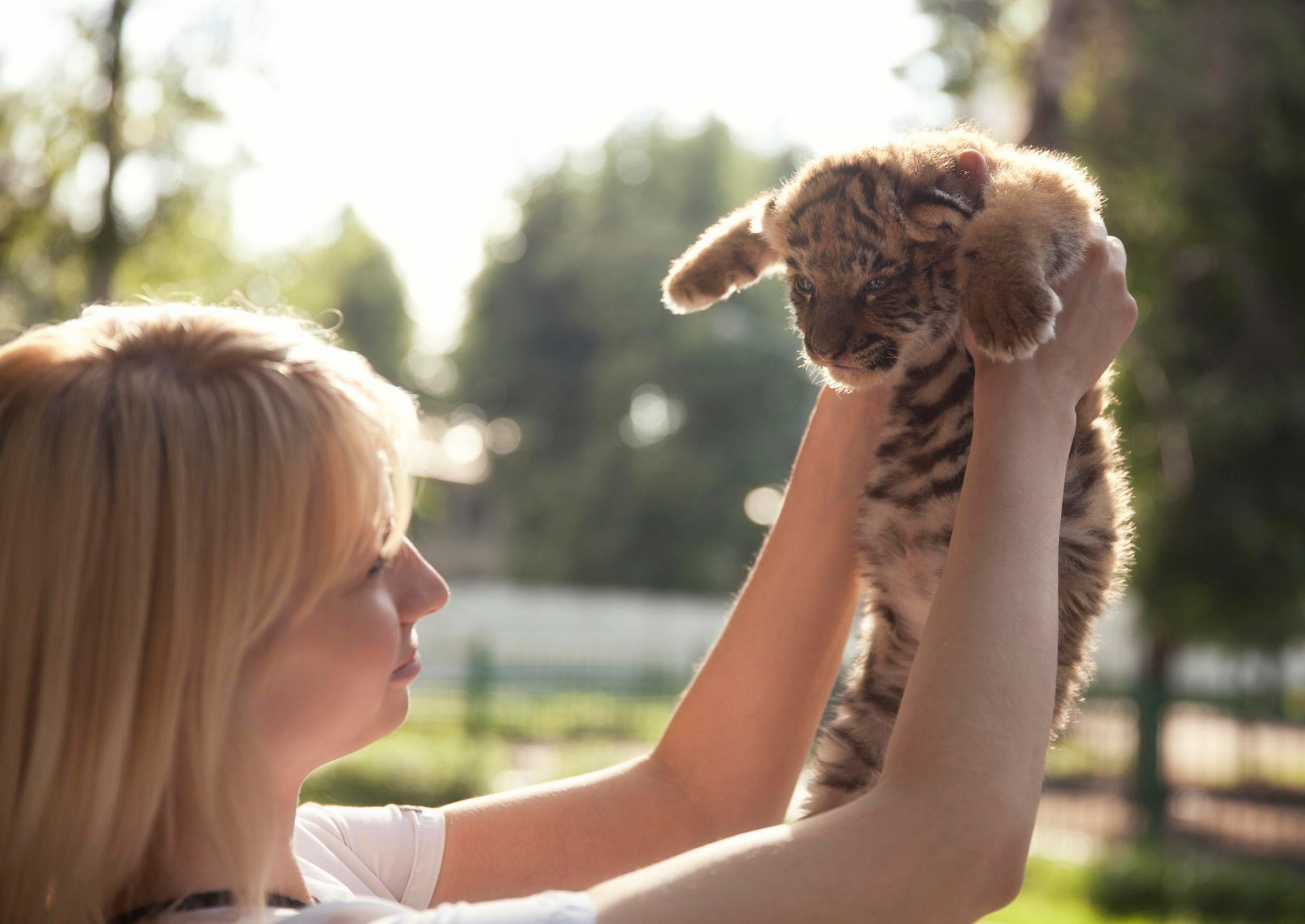 Das Mädchen hebt ein Tigermädchen an ihren Armen auf