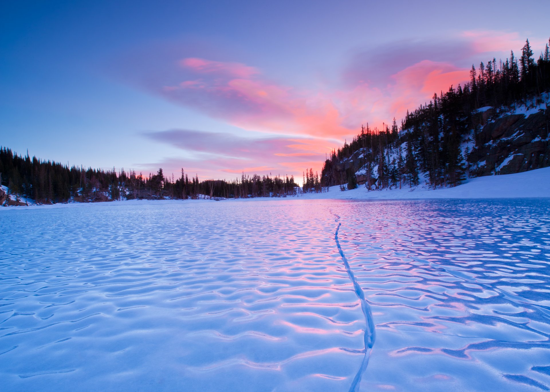 Morgendämmerung durch Eis und Schnee des Februarwaldes