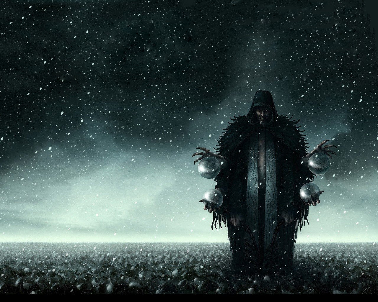 Der Bösewicht hält die Kugeln in seinen vier Händen und es schneit