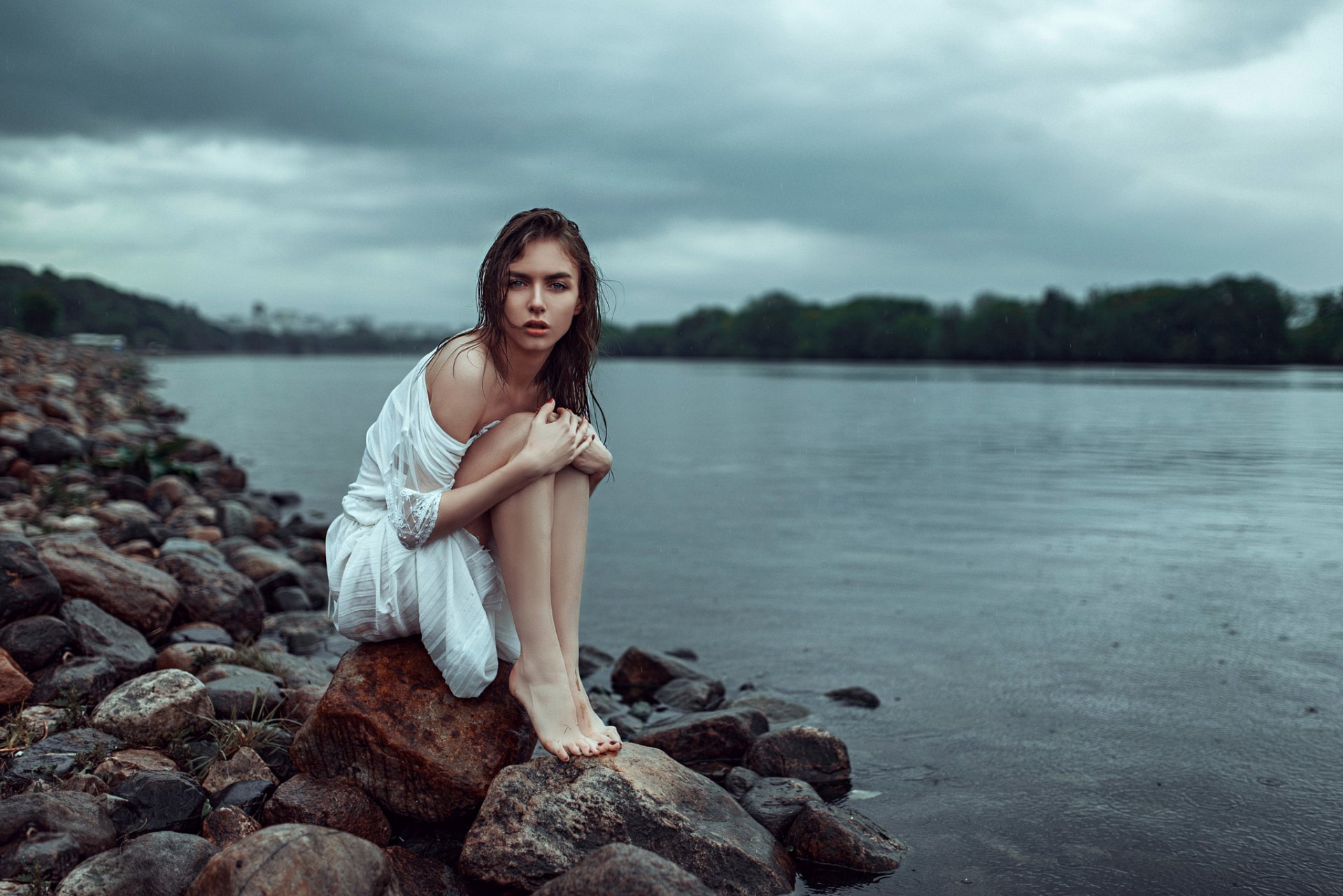 Schönes Mädchen auf dem Hintergrund des Flusses