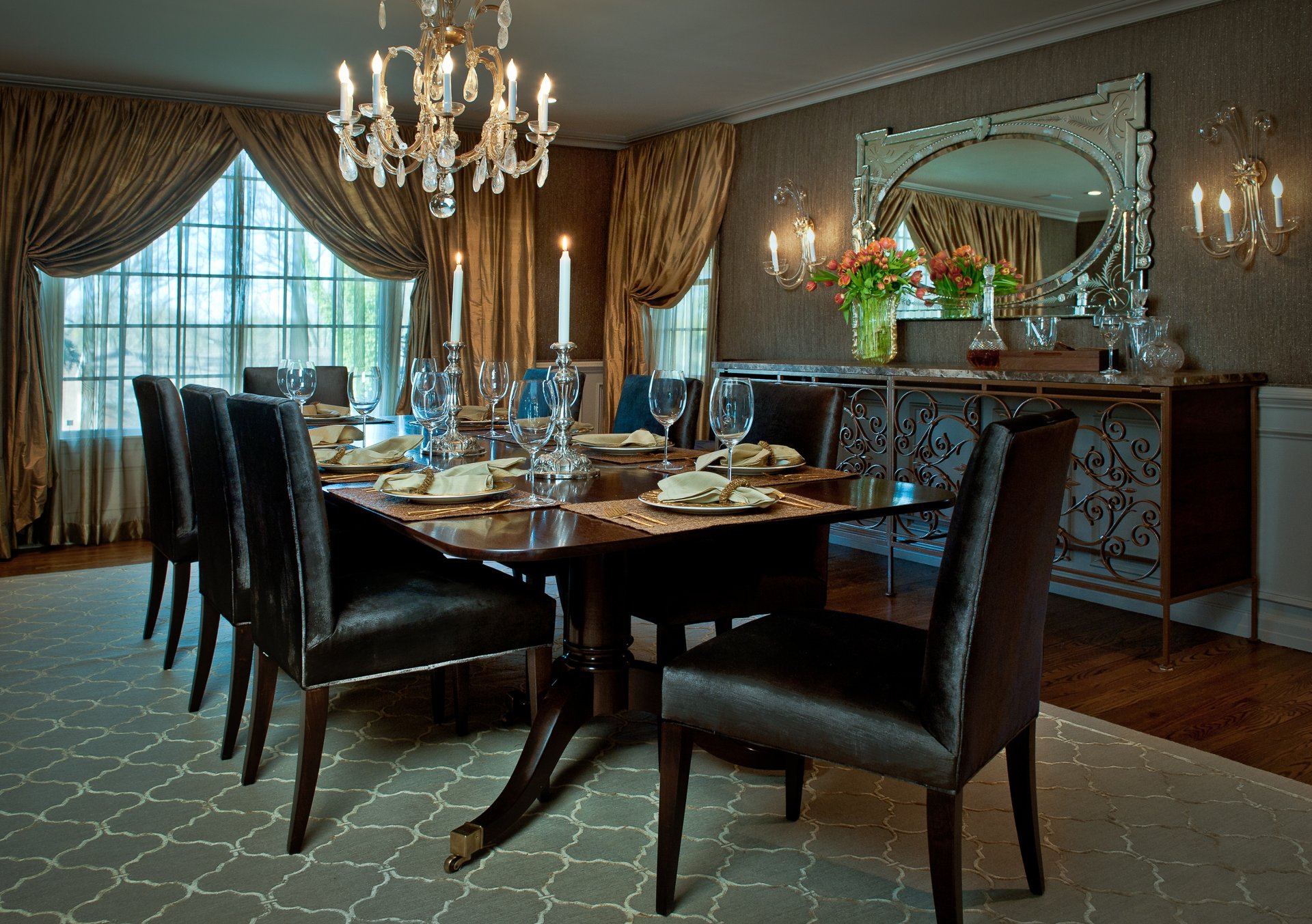 Esszimmer mit dunklen Möbeln und großem Kronleuchter