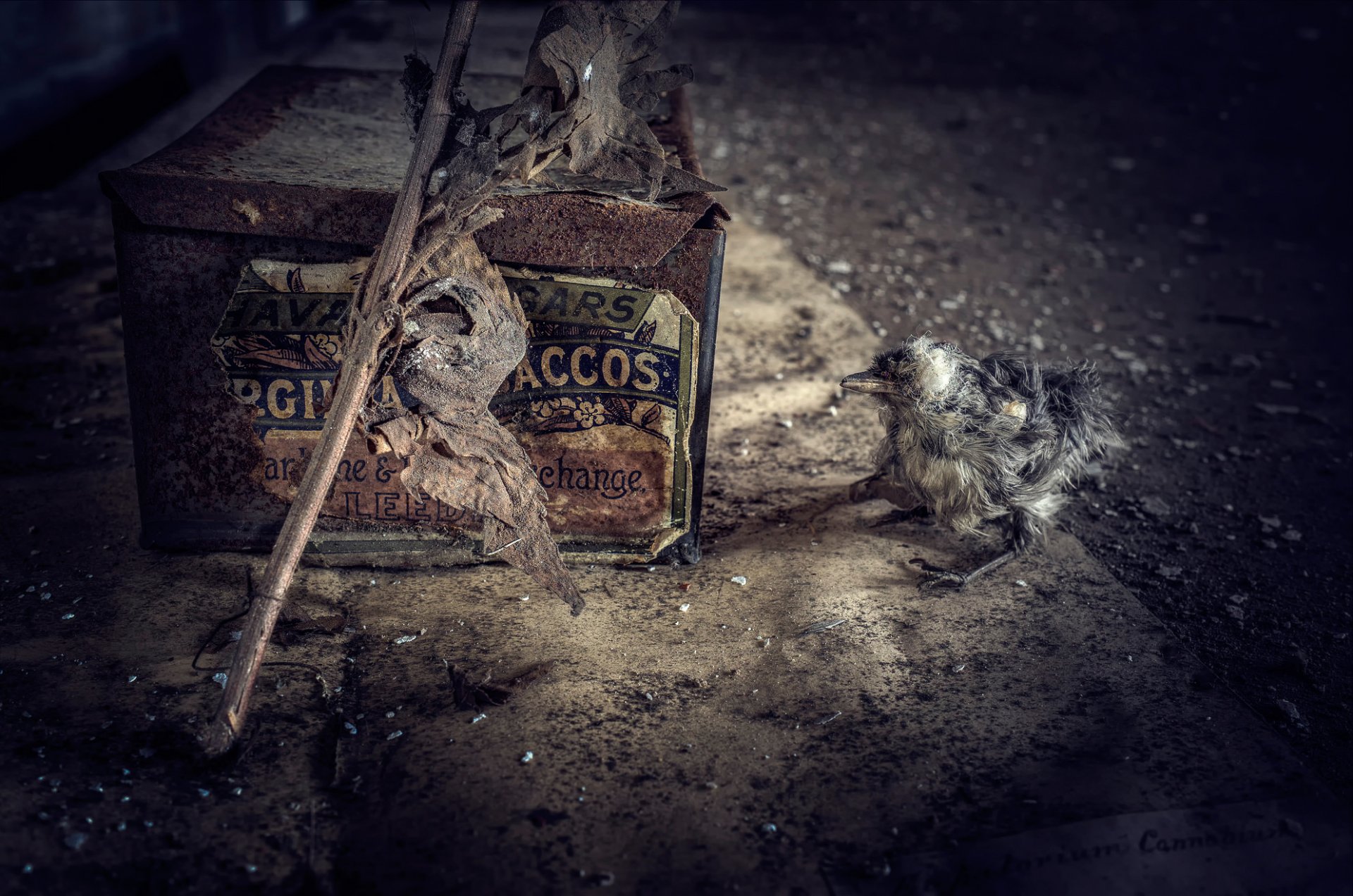 Ein verdrehter Vogel sitzt neben einer verrosteten Kiste