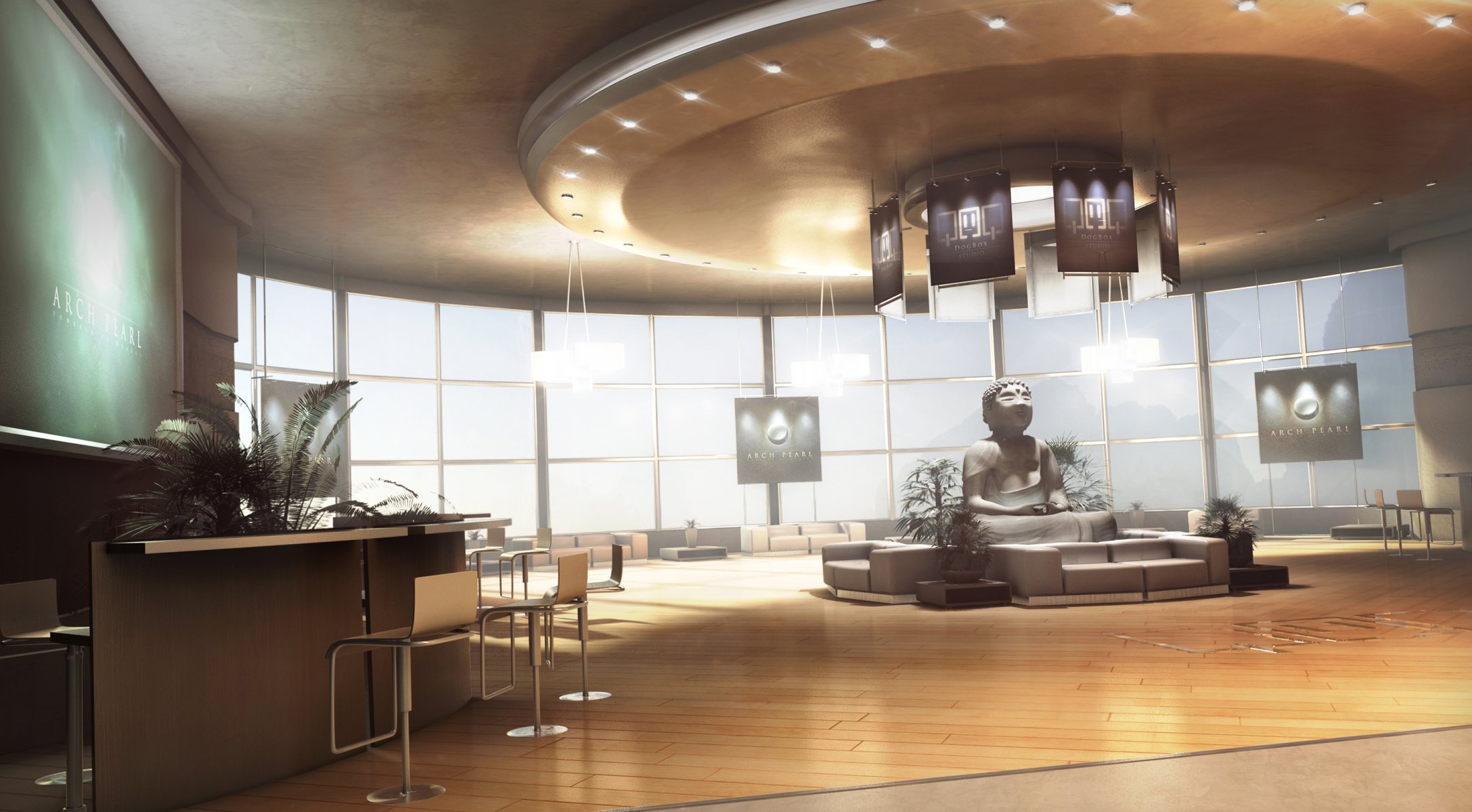 Studio mit niedriger Decke und einem Buddha in der Mitte