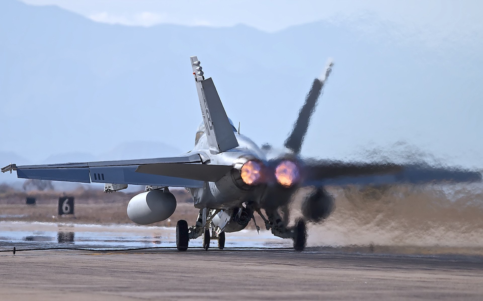 Ein Kampfflugzeug auf der Landebahn . Rückansicht