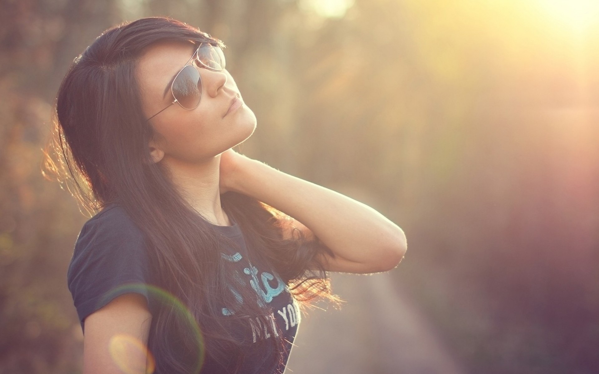 Das Mädchen schwelgt in den Strahlen des Sonnenuntergangs