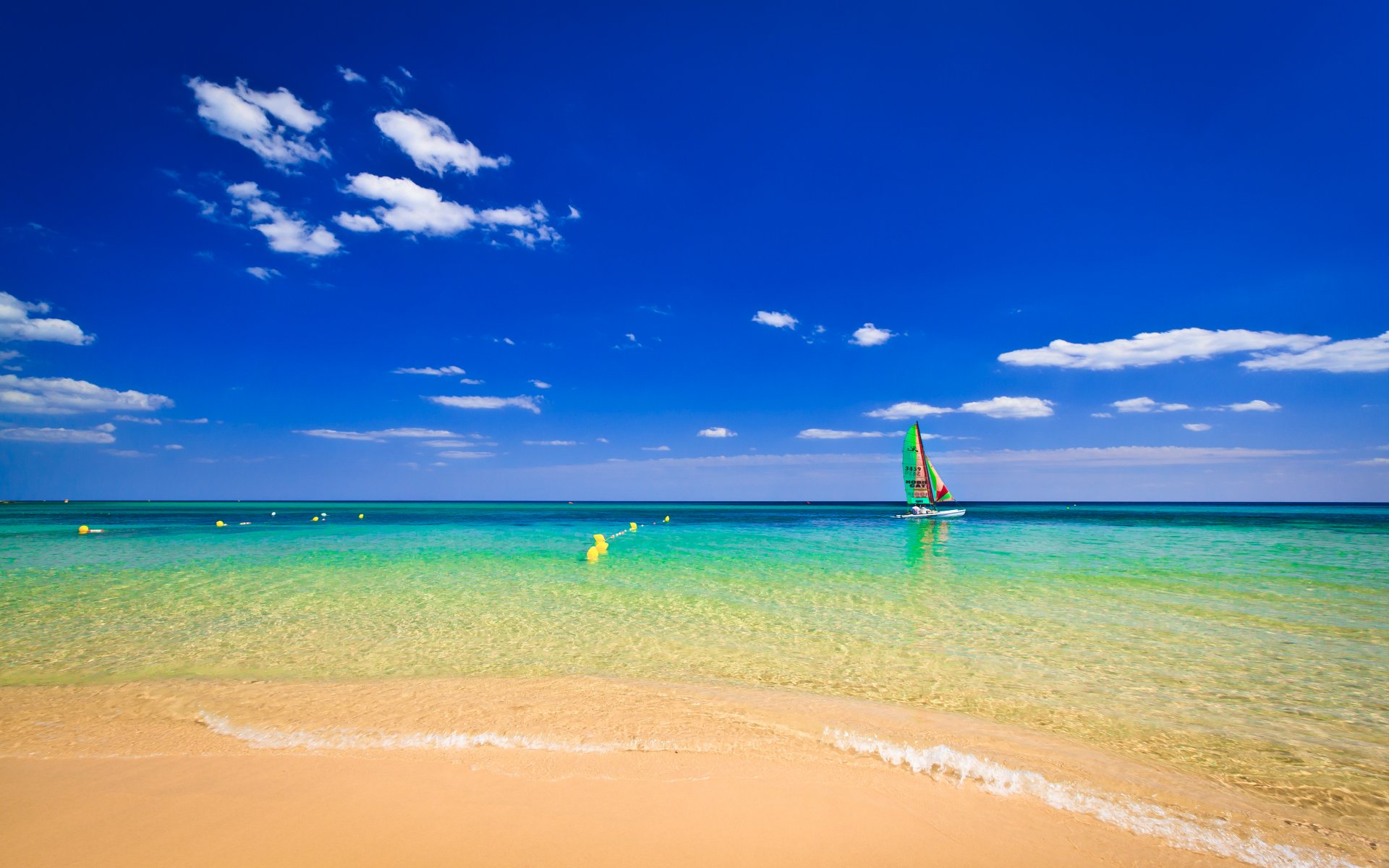 Die Yacht schwimmt an einem weißen Strand