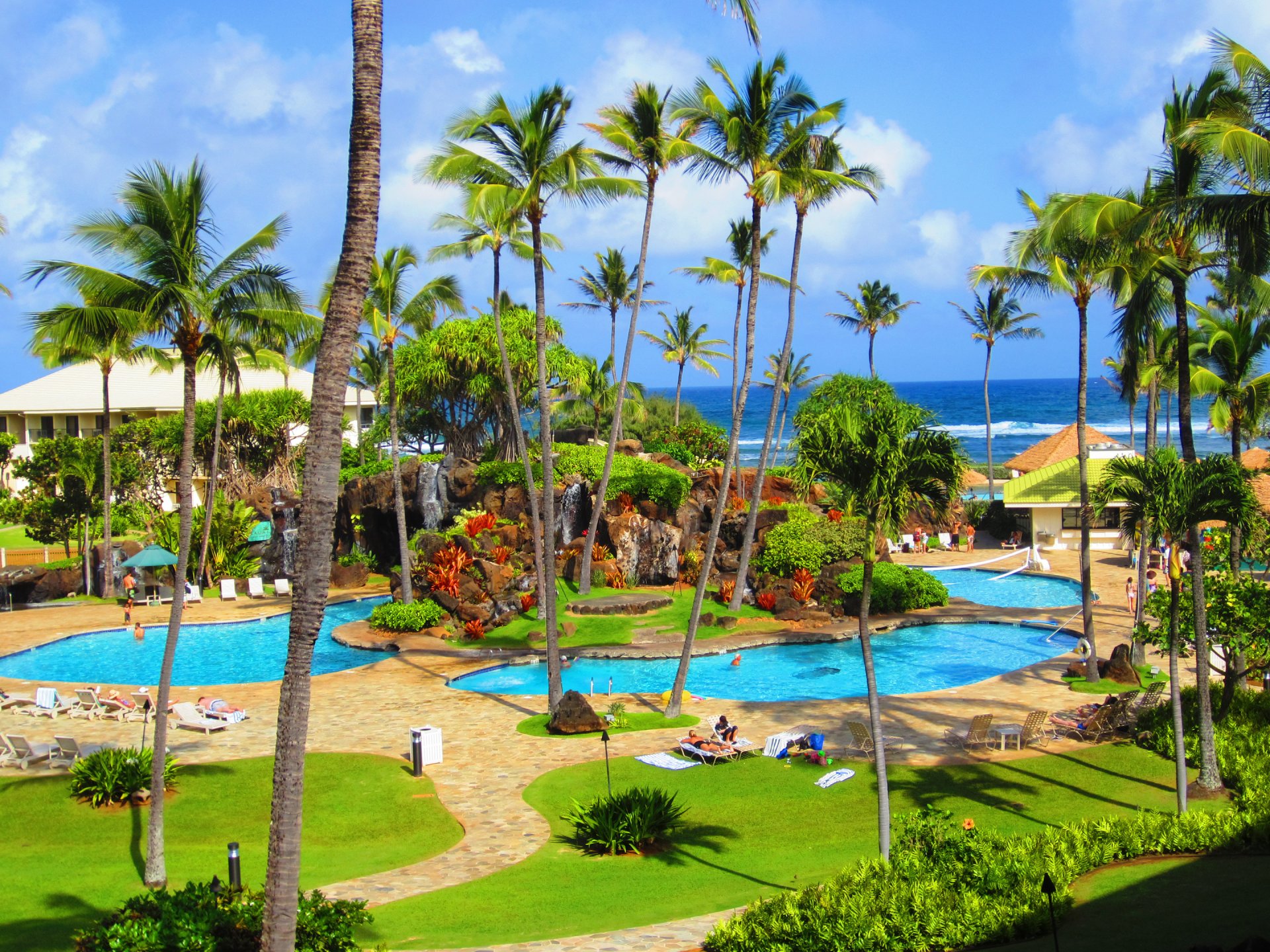 Der Felsen hinter dem weißen Strand. Palmen und Wolken