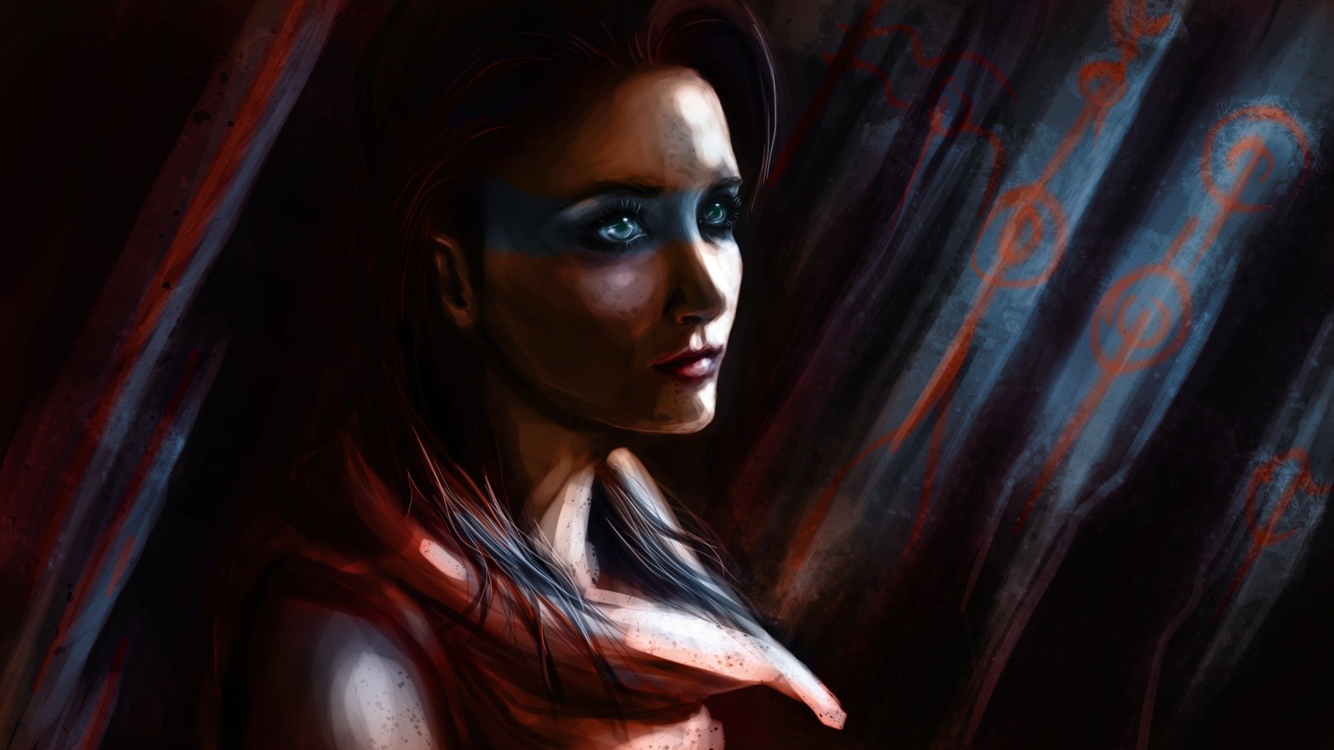 Düstere Zeichnung einer Brünette mit blauen Augen