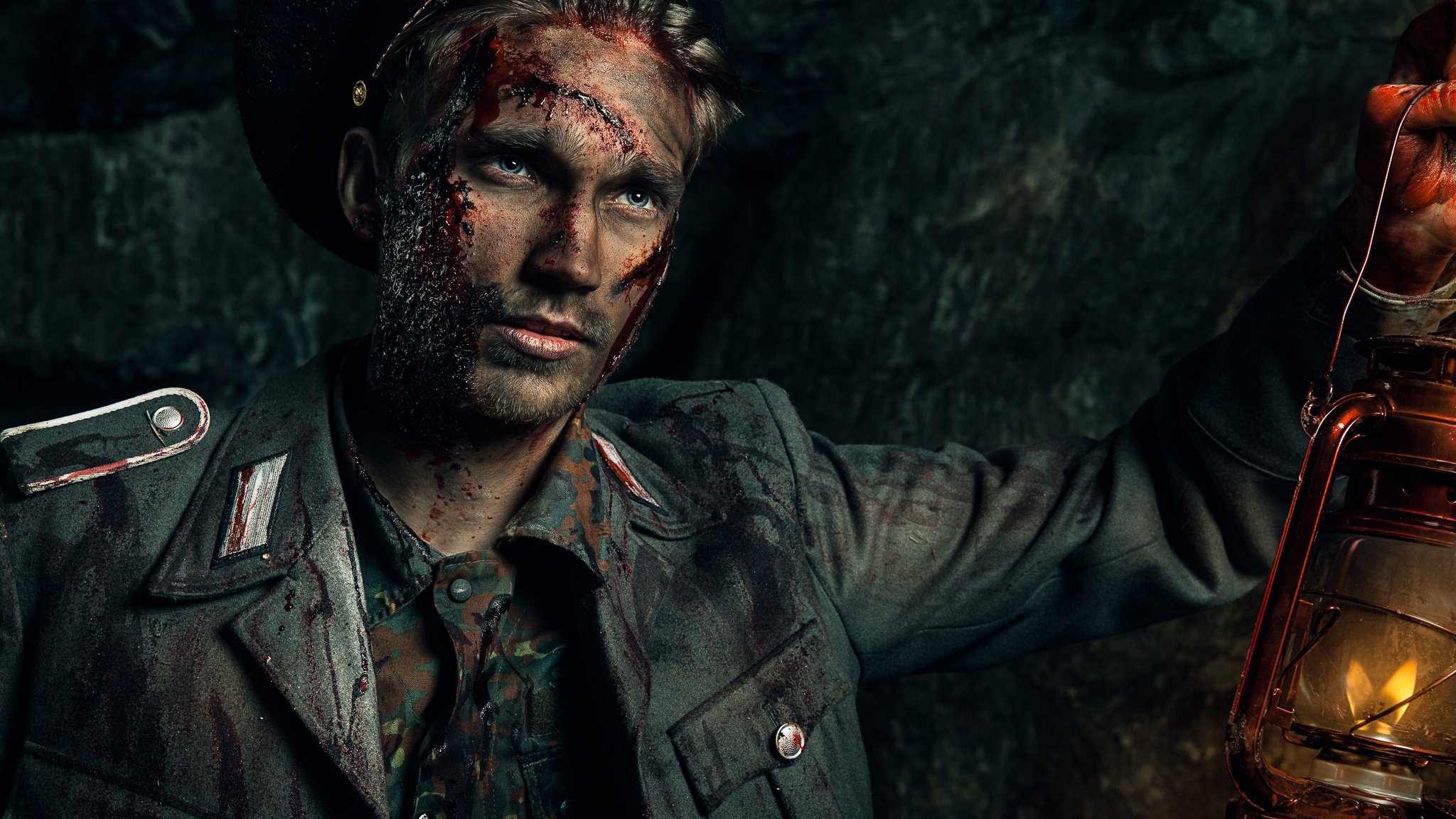 Ein Soldat im Hinterhalt schaut in den optischen Anblick seiner Waffe