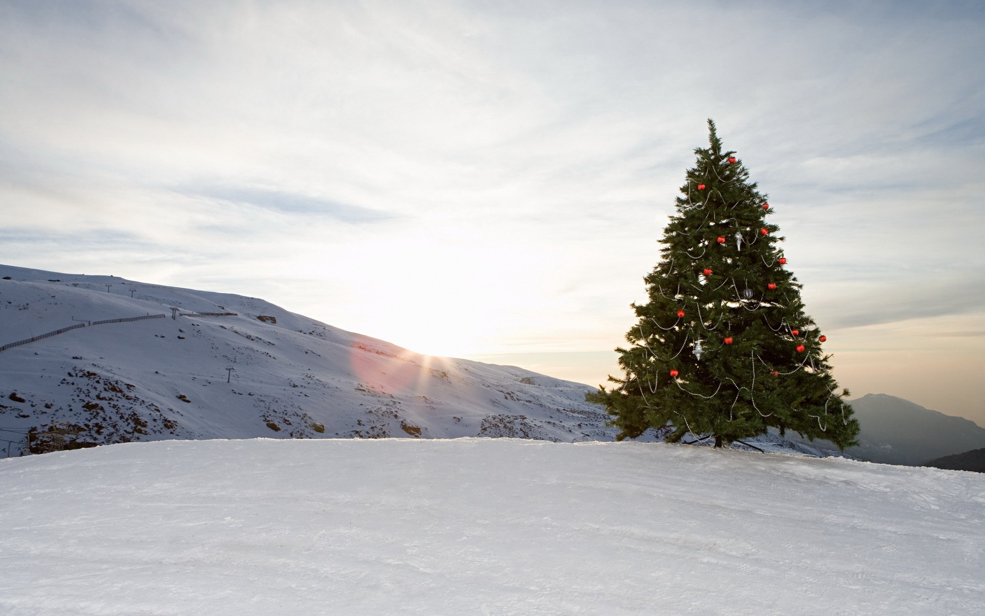 Winterberge und geschmückter Weihnachtsbaum