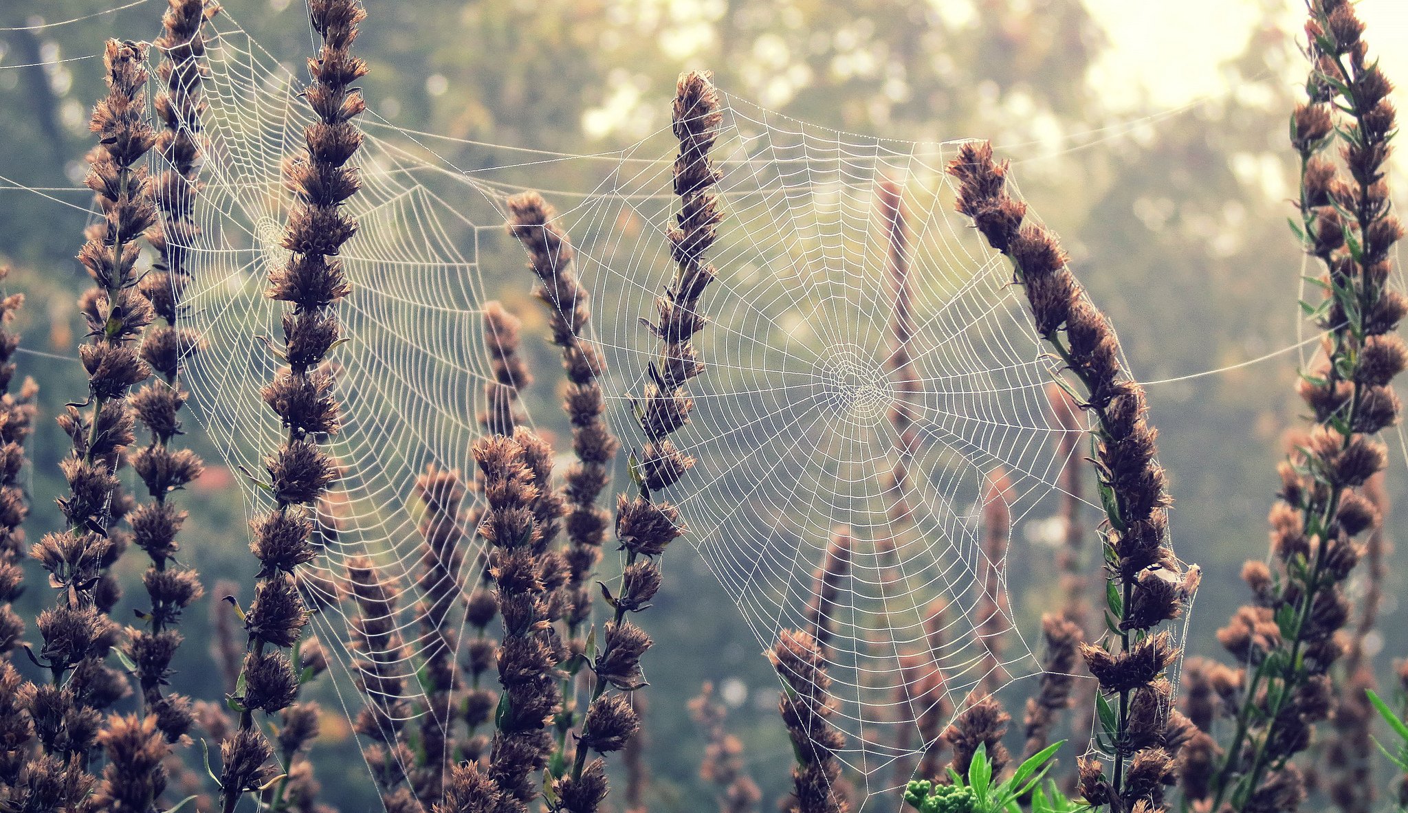 Pflanzen, die im Sonnenlicht mit Spinnweben bedeckt sind
