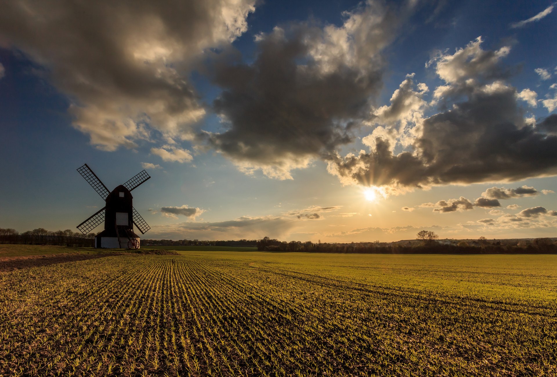 Die Mühle auf dem grenzenlosen Feld wird von der Sonne beleuchtet, die sich durch dichte Wolken schleicht