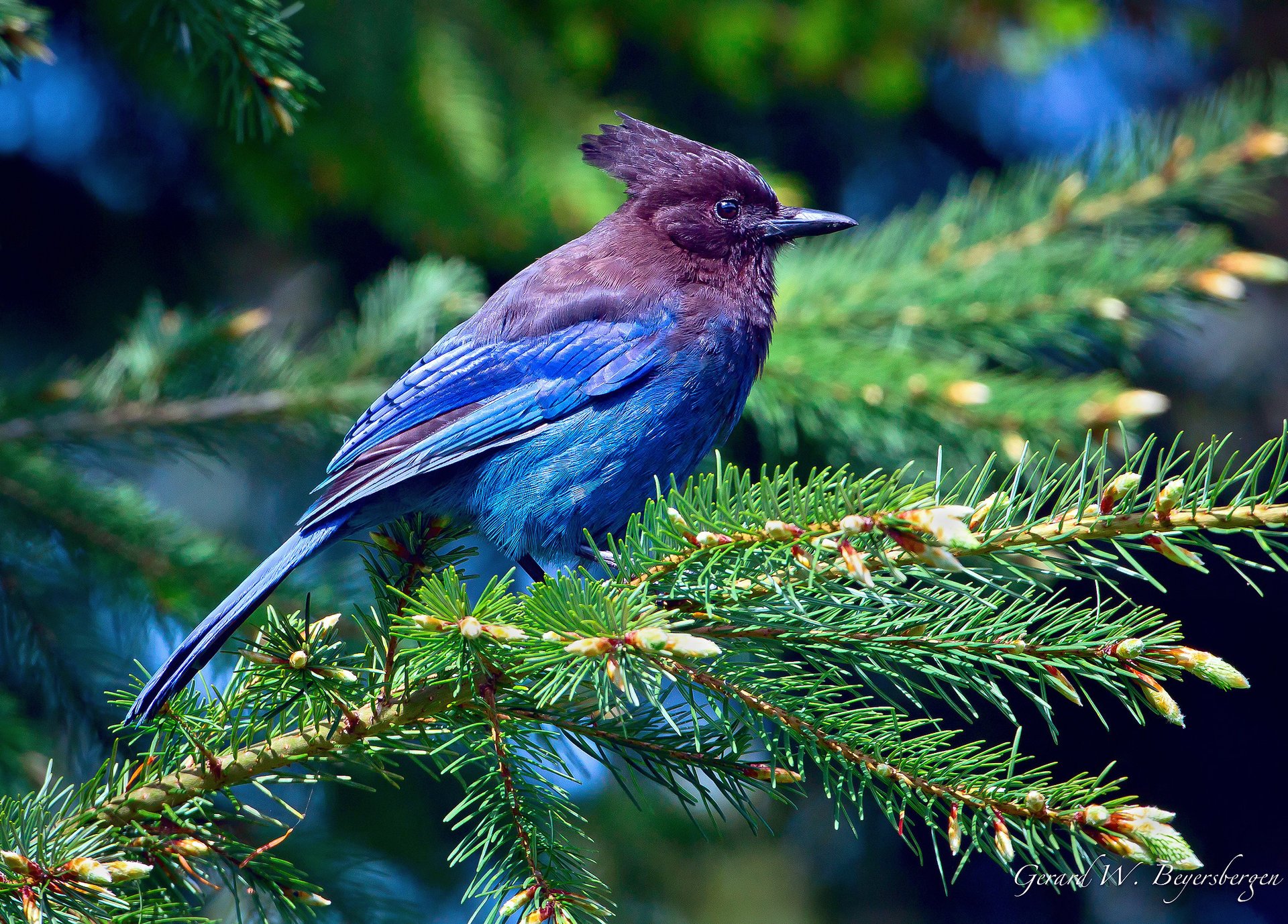 Blauer chubaty Eichelhäher sitzt auf einem Baum