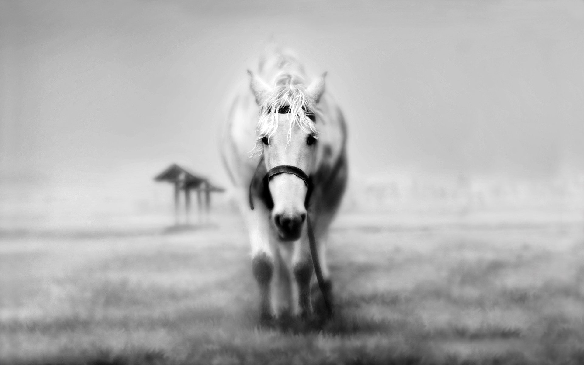 Ein graues Pferd im Feld. Einfarbiger Hintergrund