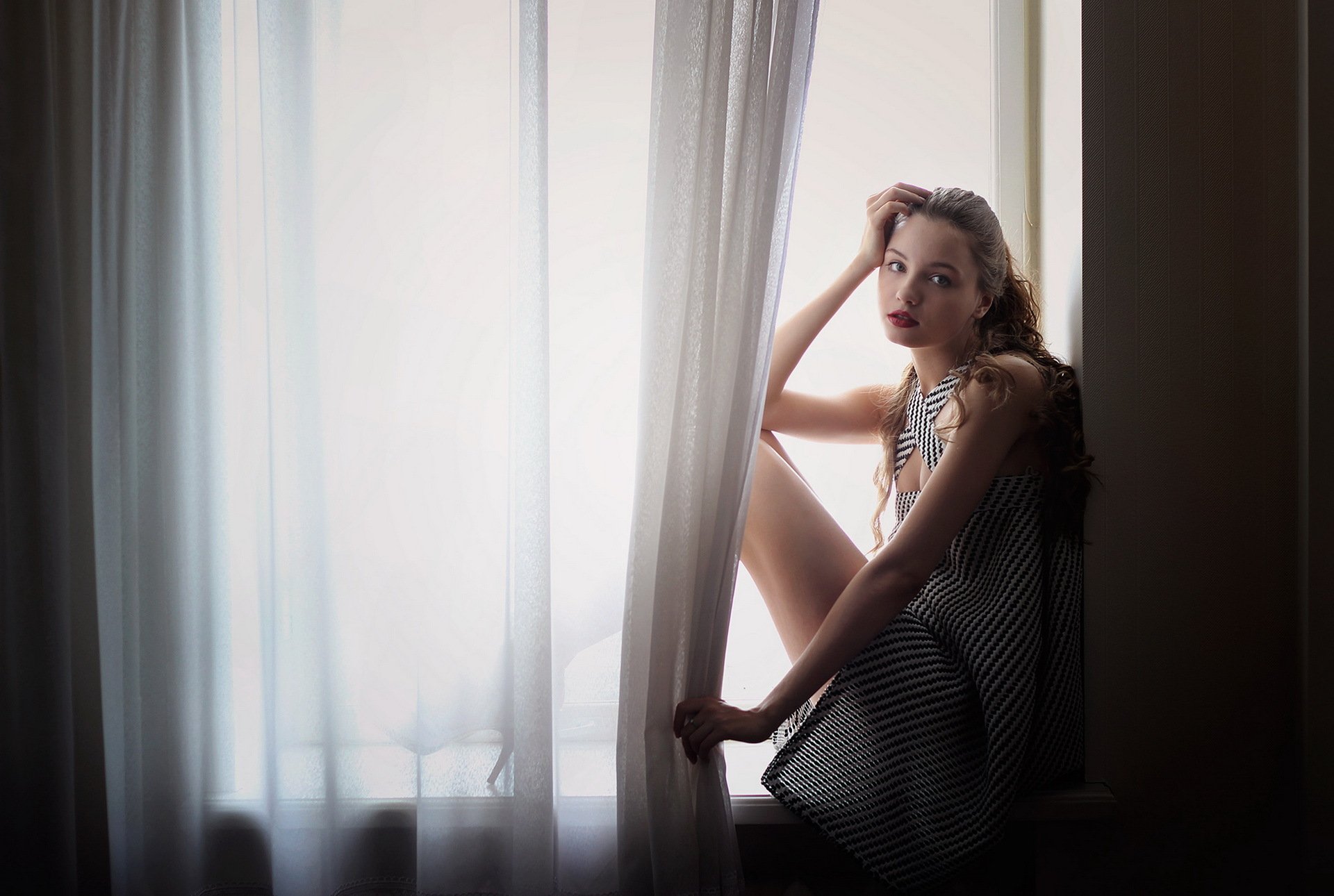 Olya schaut aus dem Fenster, eine entzückende Reflexion