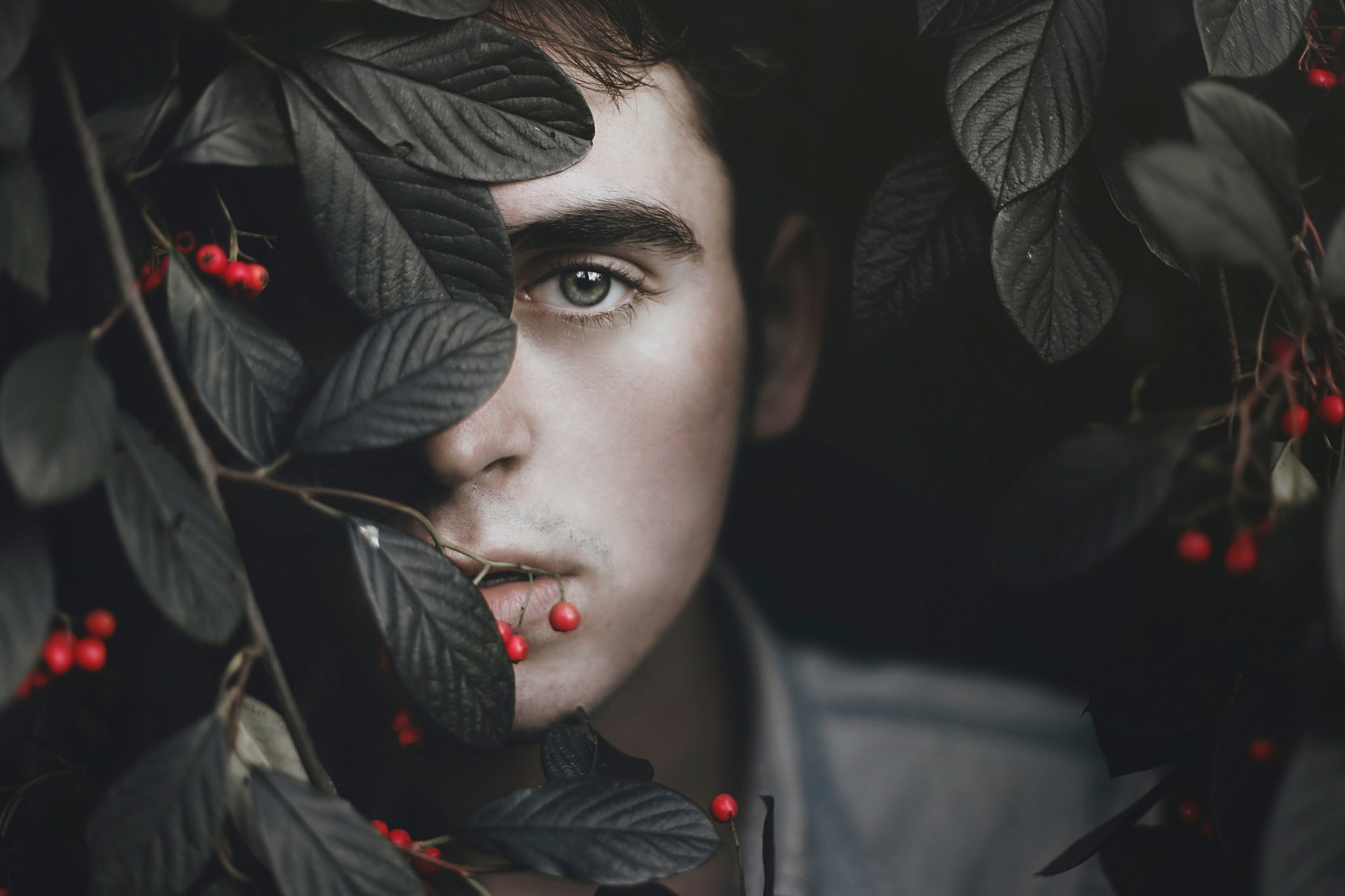 Der Parent schaut hinter einem Baum mit roten Beeren zu