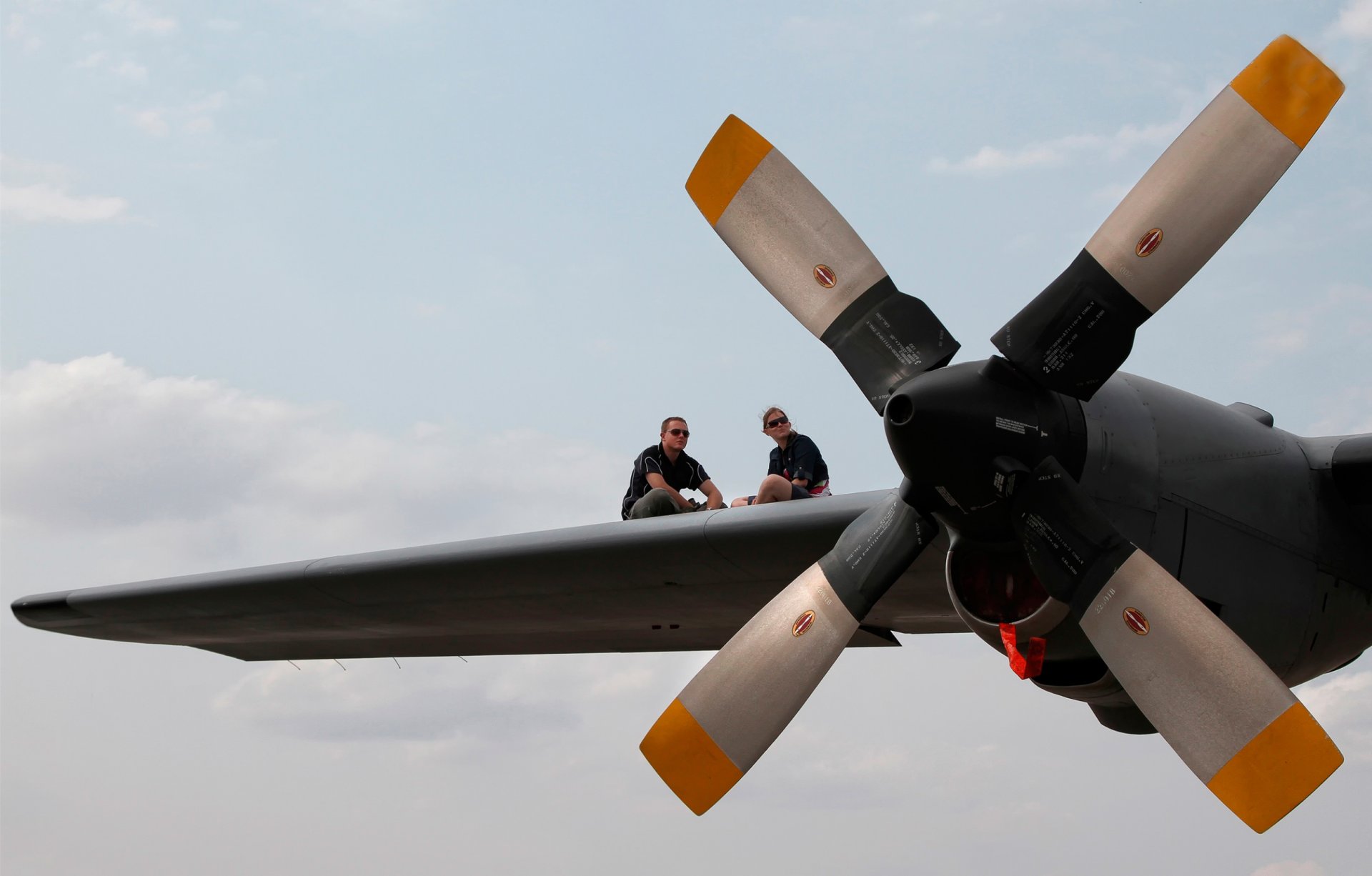 Zwei Menschen sitzen hoch am Himmel auf dem Flügel eines Flugzeugs