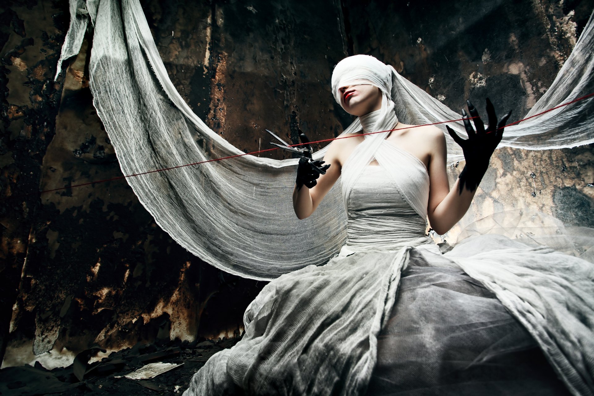 Ein seltsames mädchen in weiß schneidet einen roten fadenEin seltsames Mädchen in weiß schneidet einen roten Faden