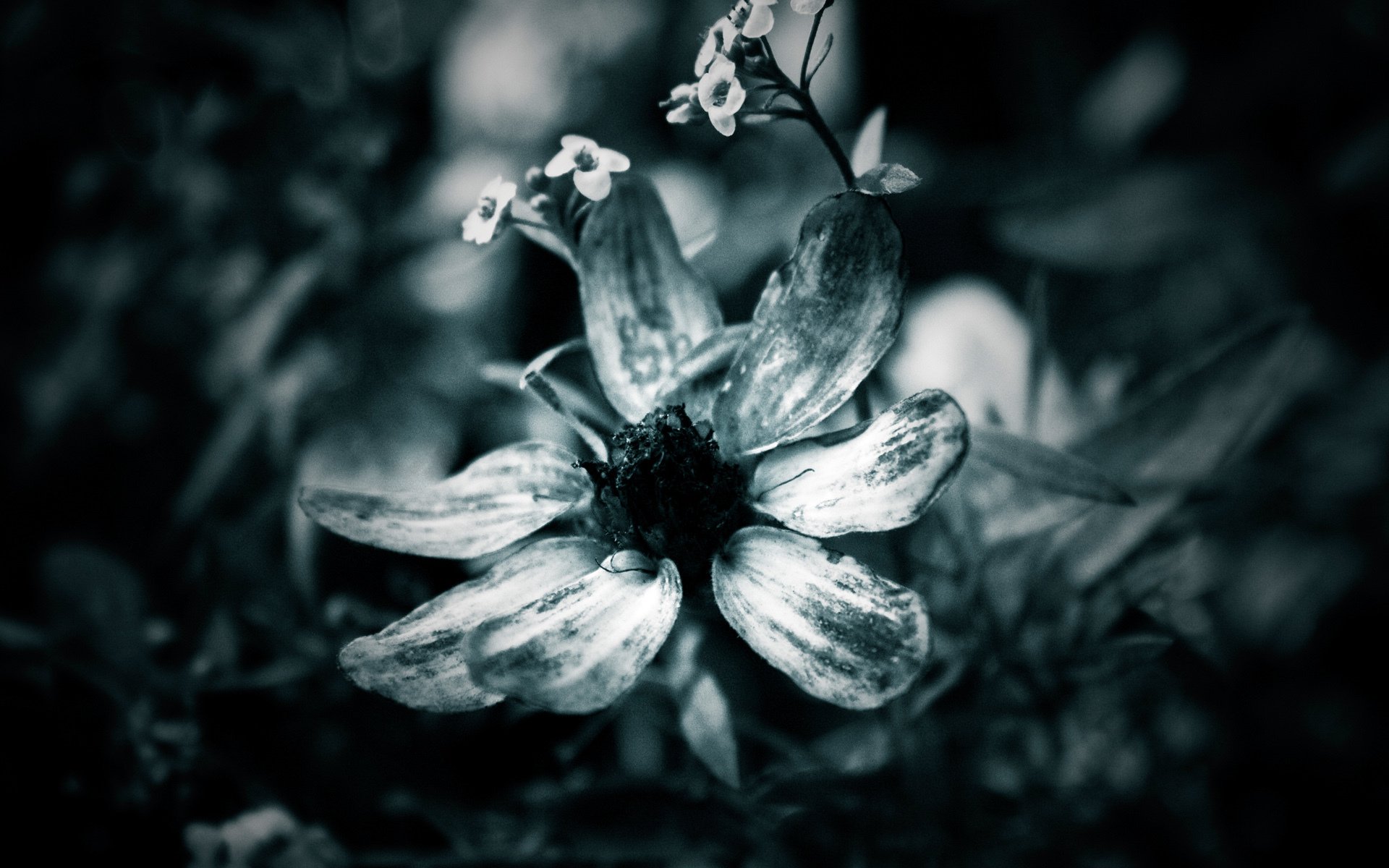 Ein Mädchen in einem schwarzen Kleid und einer Gasmaske sitzt neben einer Blume