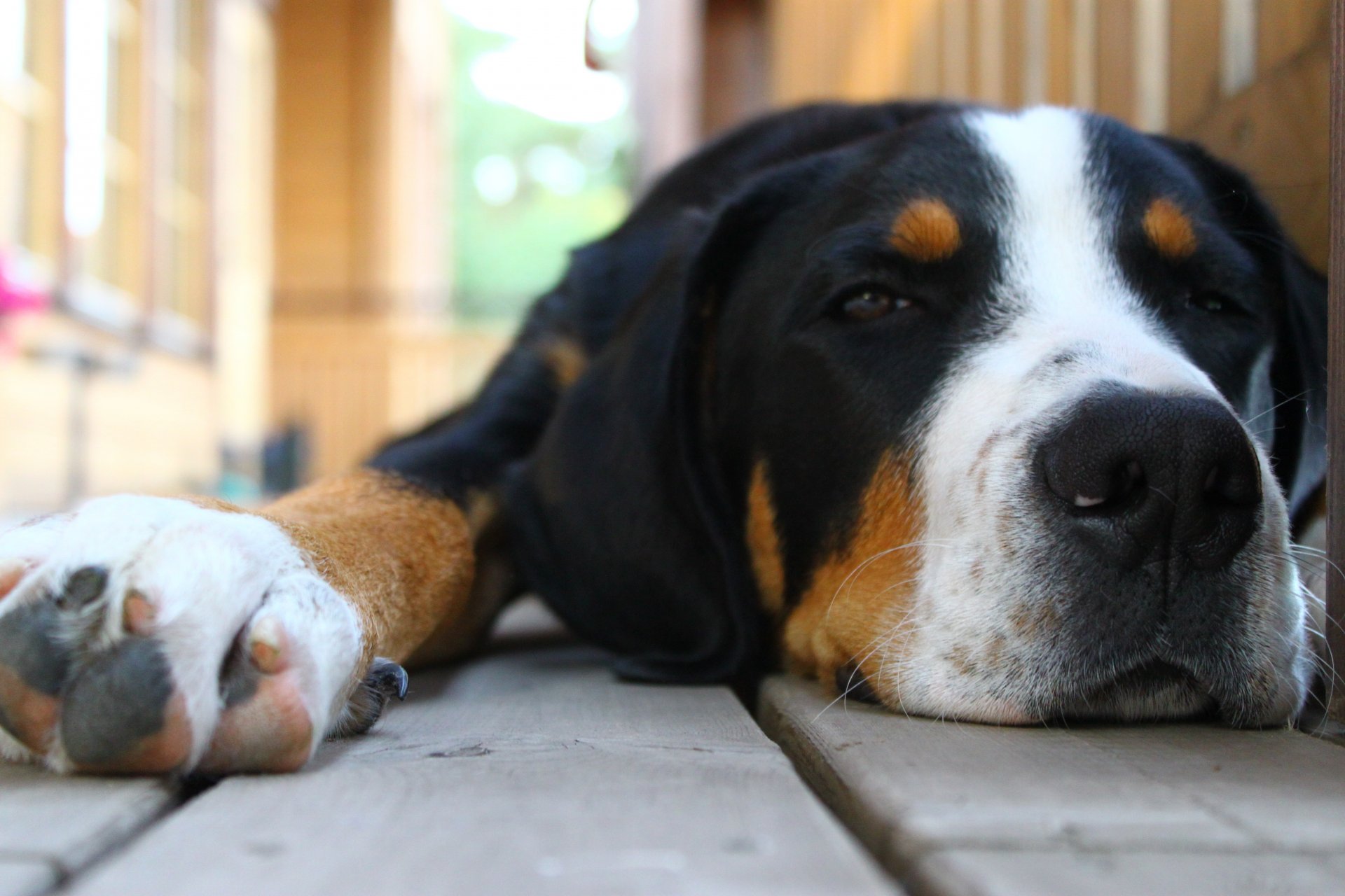 Der hund streckte die zunge heraus, blumen auf dem kopfDer Hund streckte die Zunge heraus, Blumen auf dem Kopf