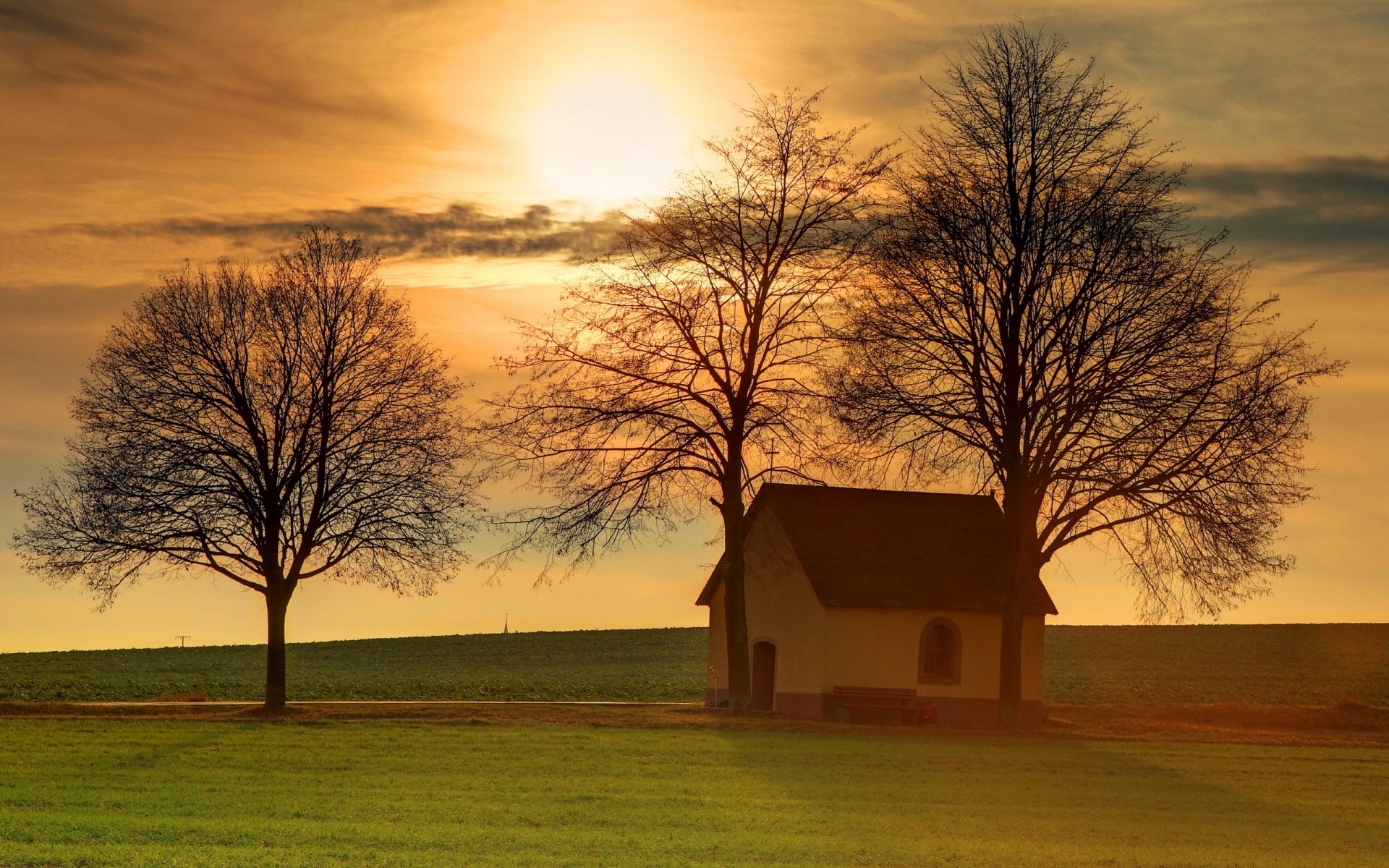 Bäume und ein haus im feld. schöner sonnenuntergangBäume und ein Haus im Feld. Schöner Sonnenuntergang