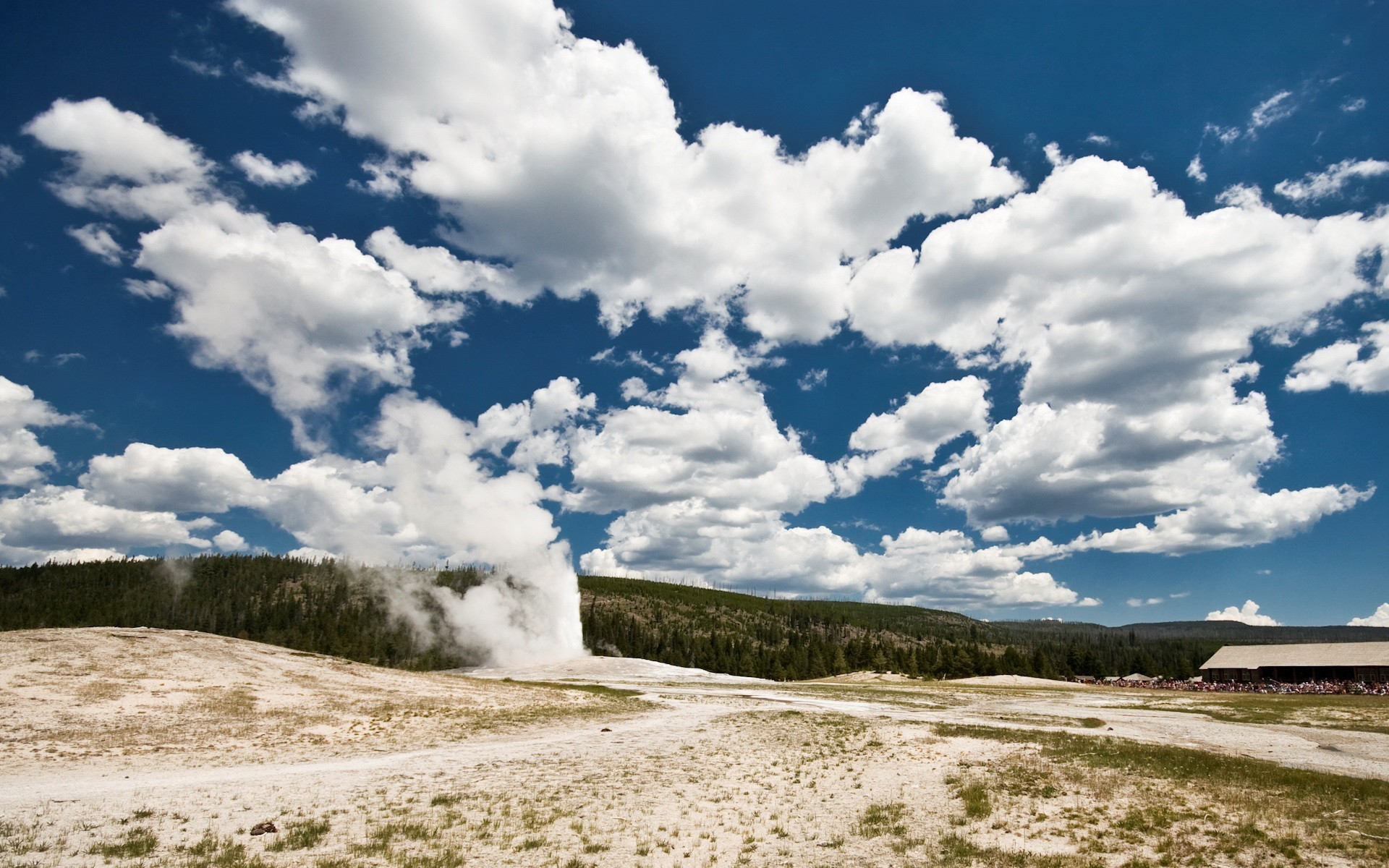 Geysir, das wasser auf dem hintergrund des waldes ableitetGeysir, das Wasser auf dem Hintergrund des Waldes ableitet