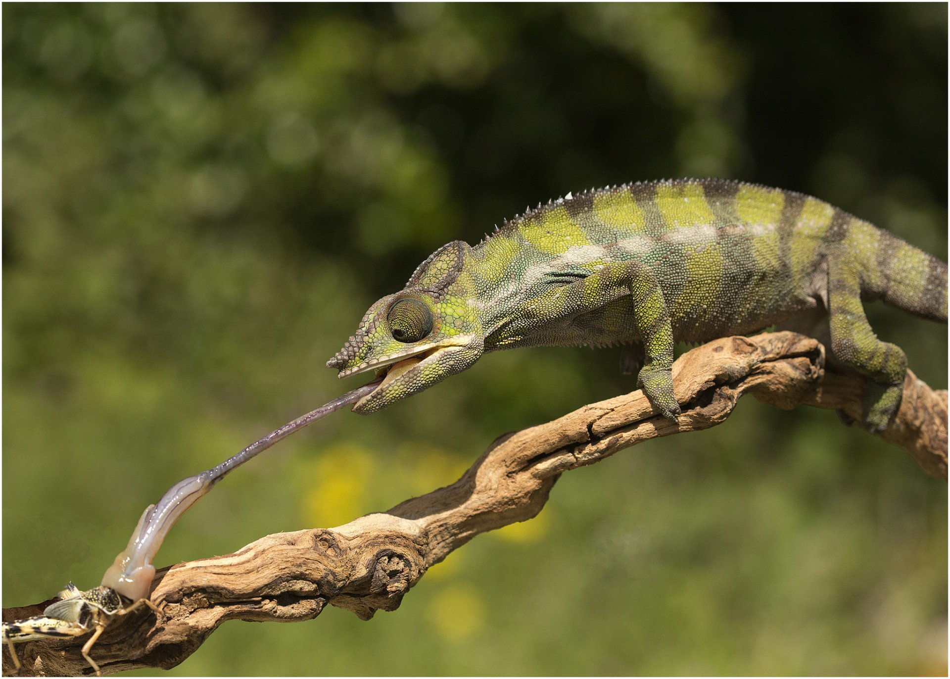 Die zunge des chamäleons auf einem ast eines baumes fotoDie Zunge des Chamäleons auf einem Ast eines Baumes Foto