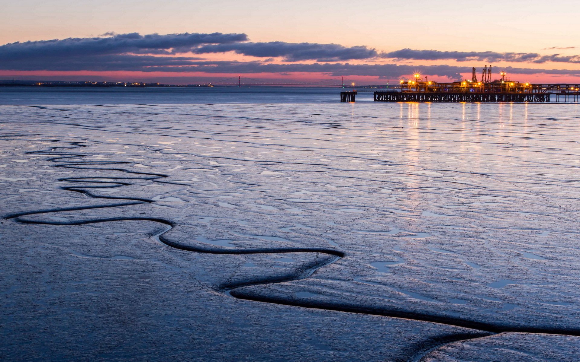 Hund im hintergrund des flusses während des sonnenuntergangsHund im Hintergrund des Flusses während des Sonnenuntergangs