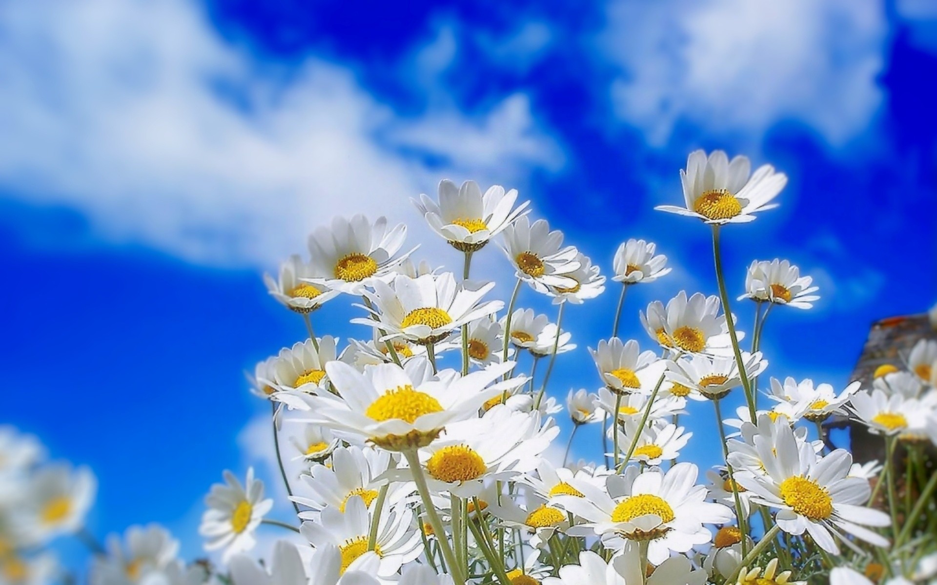 Im sommer schmückt die natur das feld mit schönen blumen wie gänseblümchen, grünen gräsern, wiesen und einem klaren himmel mit watte ähnlichen wolkenIm Sommer schmückt die Natur das Feld mit schönen Blumen wie Gänseblümchen, grünen Gräsern, Wiesen und einem klaren Himmel mit Watte ähnlichen Wolken