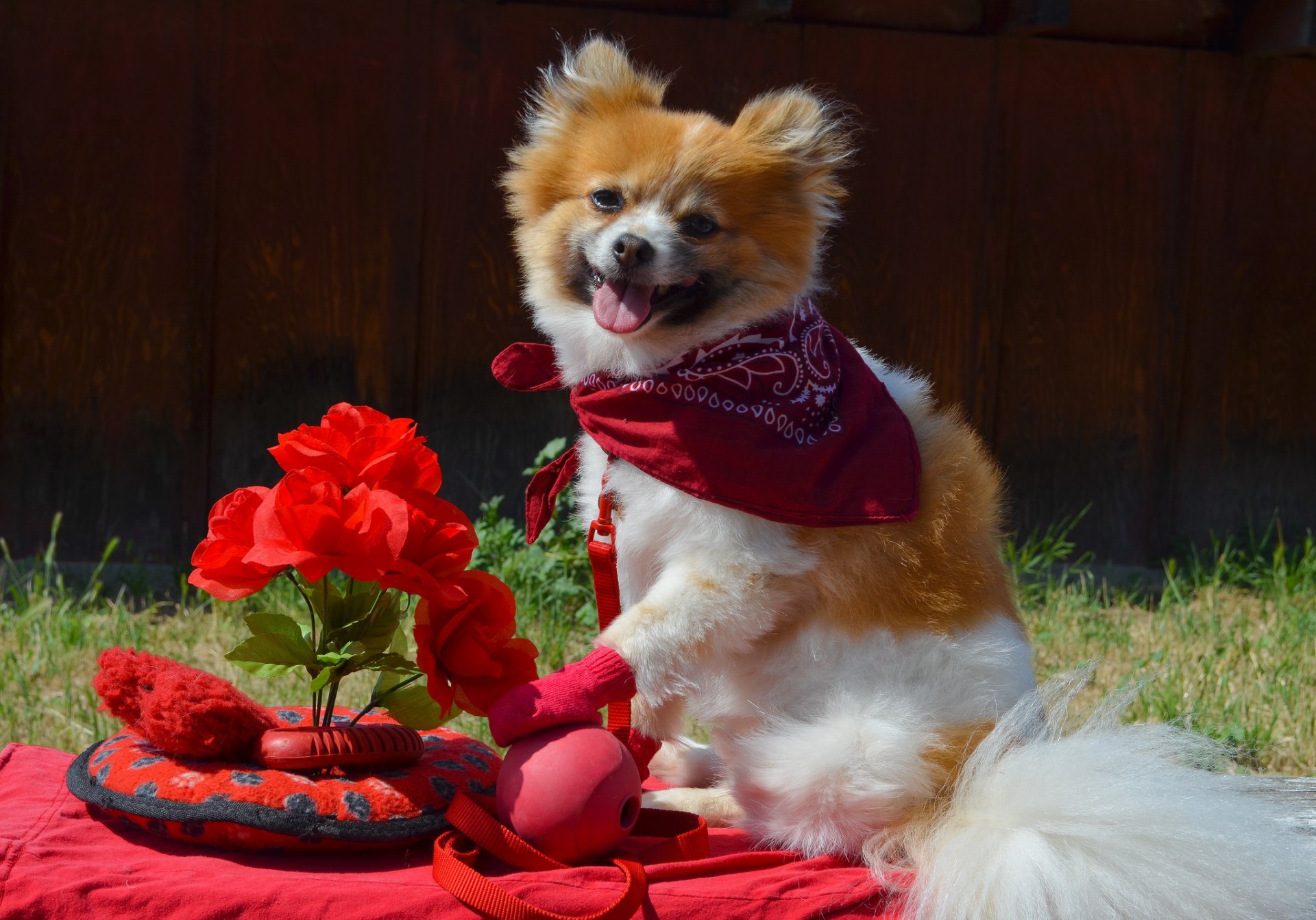 Weißer Hund in roter Jacke