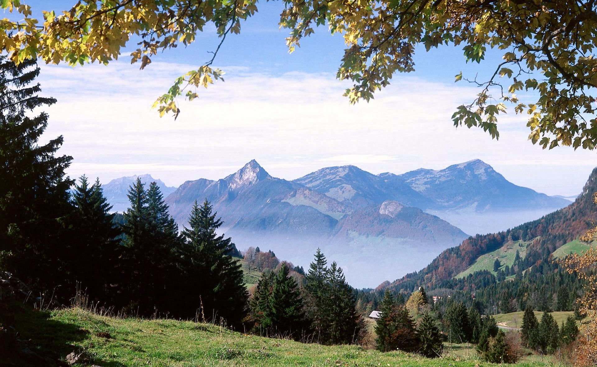 Lichtung in einem grünen wald, der vor dem hintergrund der hohen berge liegtLichtung in einem grünen Wald, der vor dem Hintergrund der hohen Berge liegt
