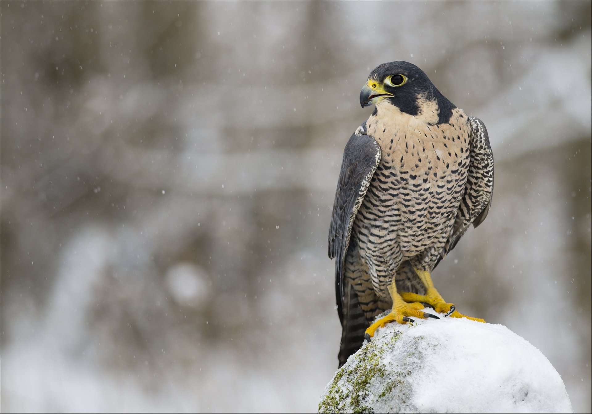 Falke sitzt auf einem mit Schnee bedeckten Stein