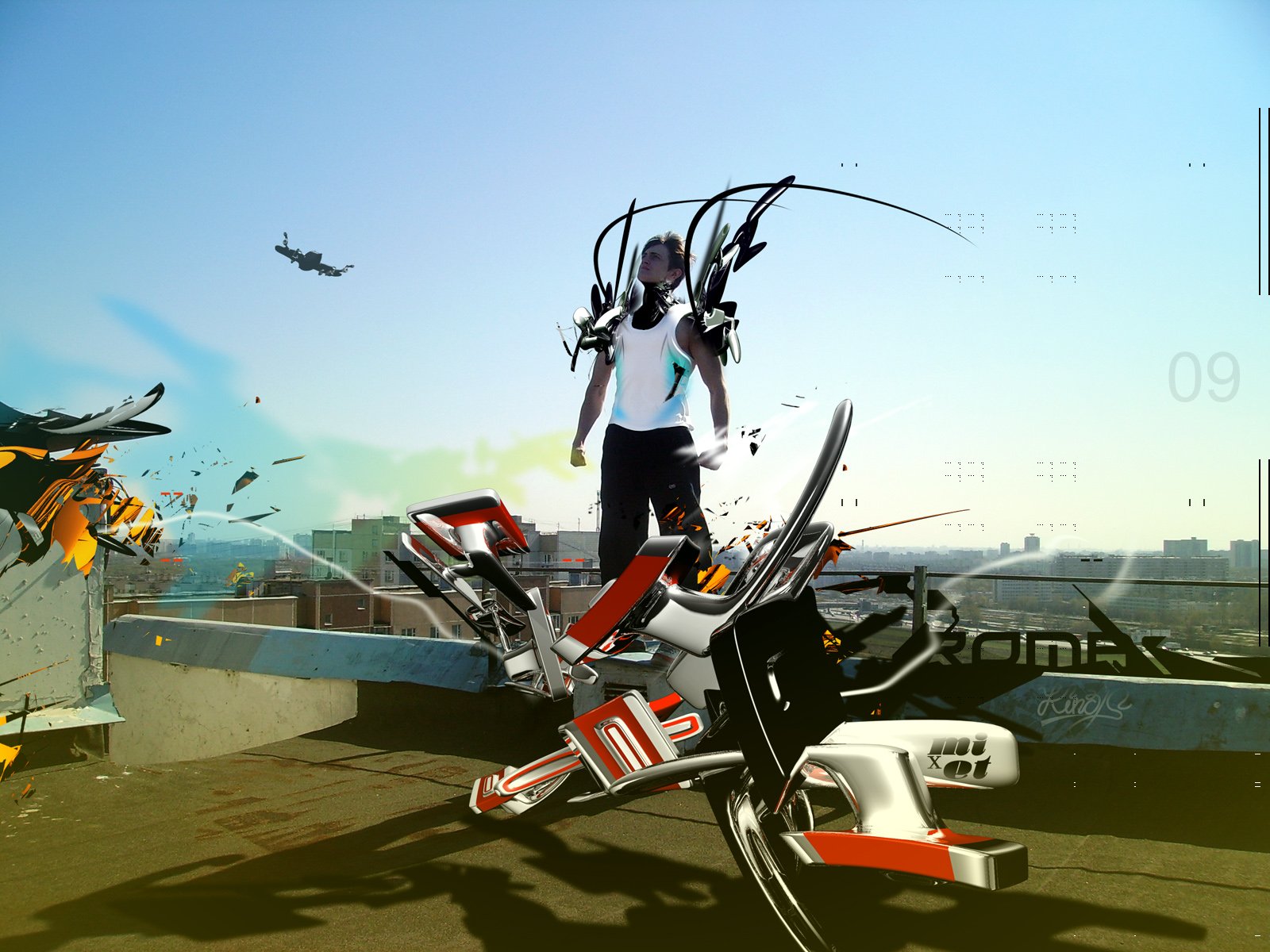 Futuristisches cartoon-bild eines mannes auf dem dachFuturistisches Cartoon-Bild eines Mannes auf dem Dach