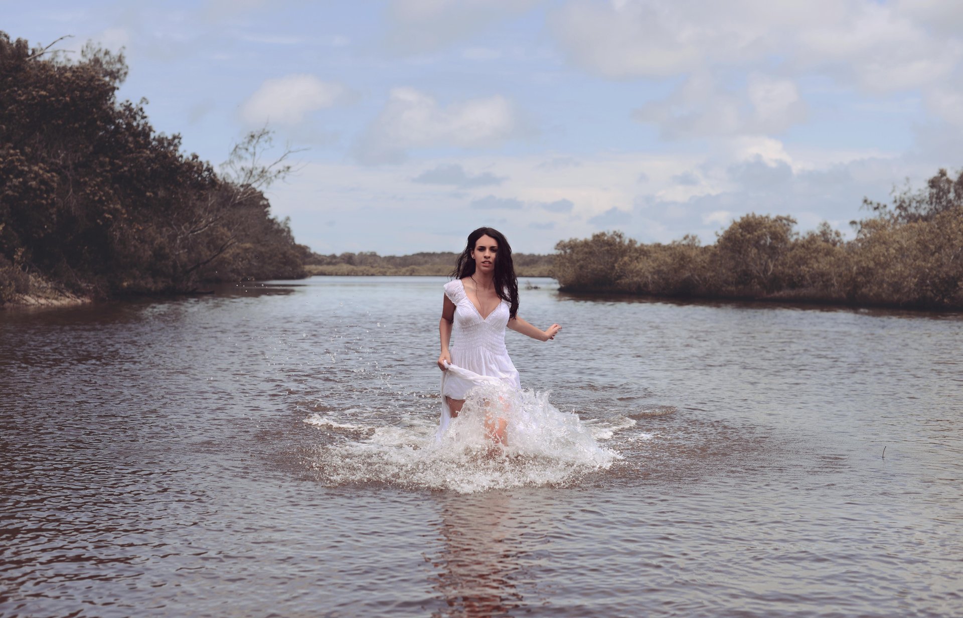 Mädchen im business-kleid schafft spritzen im flussMädchen im business-Kleid schafft Spritzen im Fluss