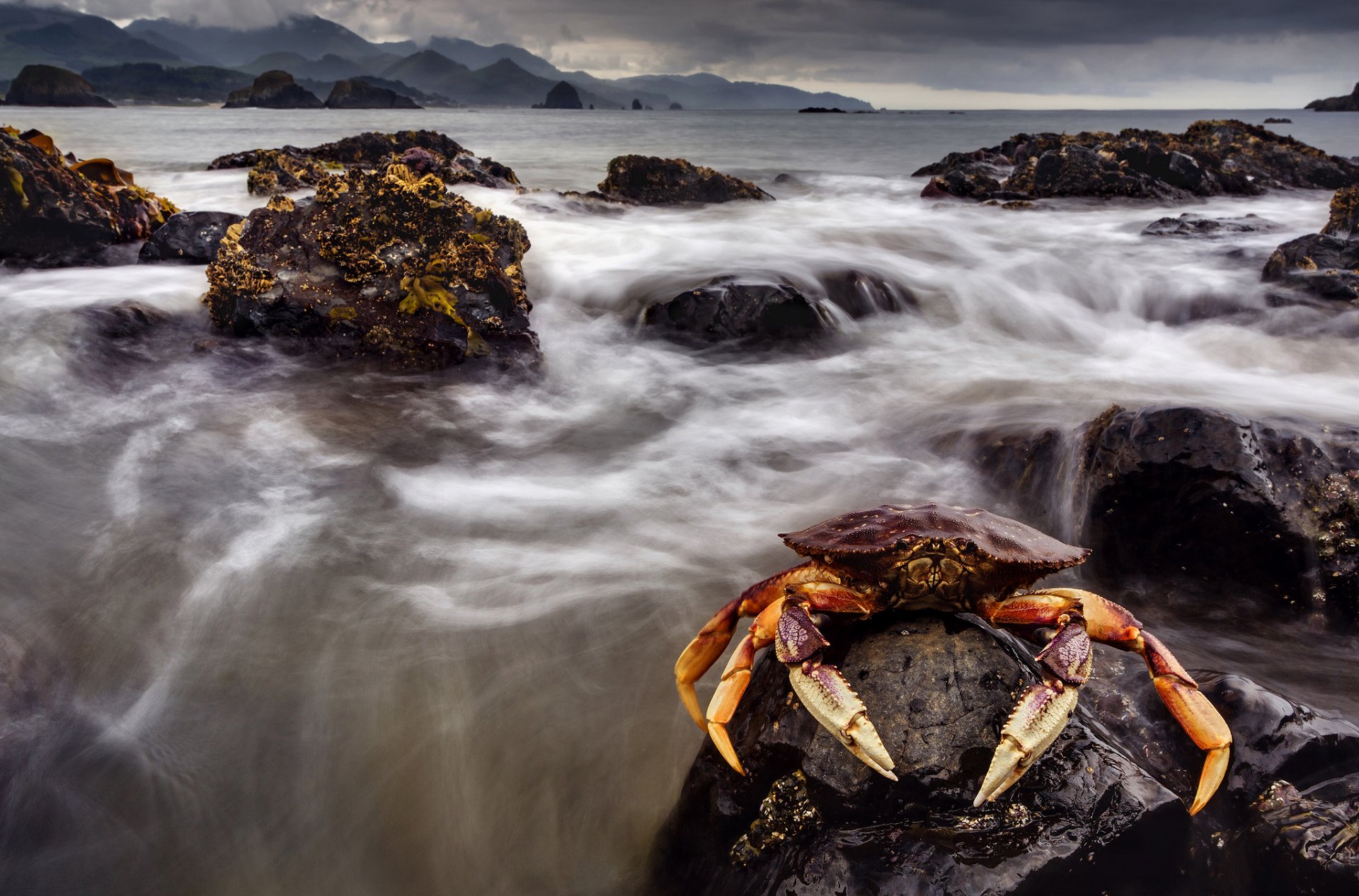 Krabbe vor dem hintergrund des pulsierenden meeresKrabbe vor dem Hintergrund des pulsierenden Meeres